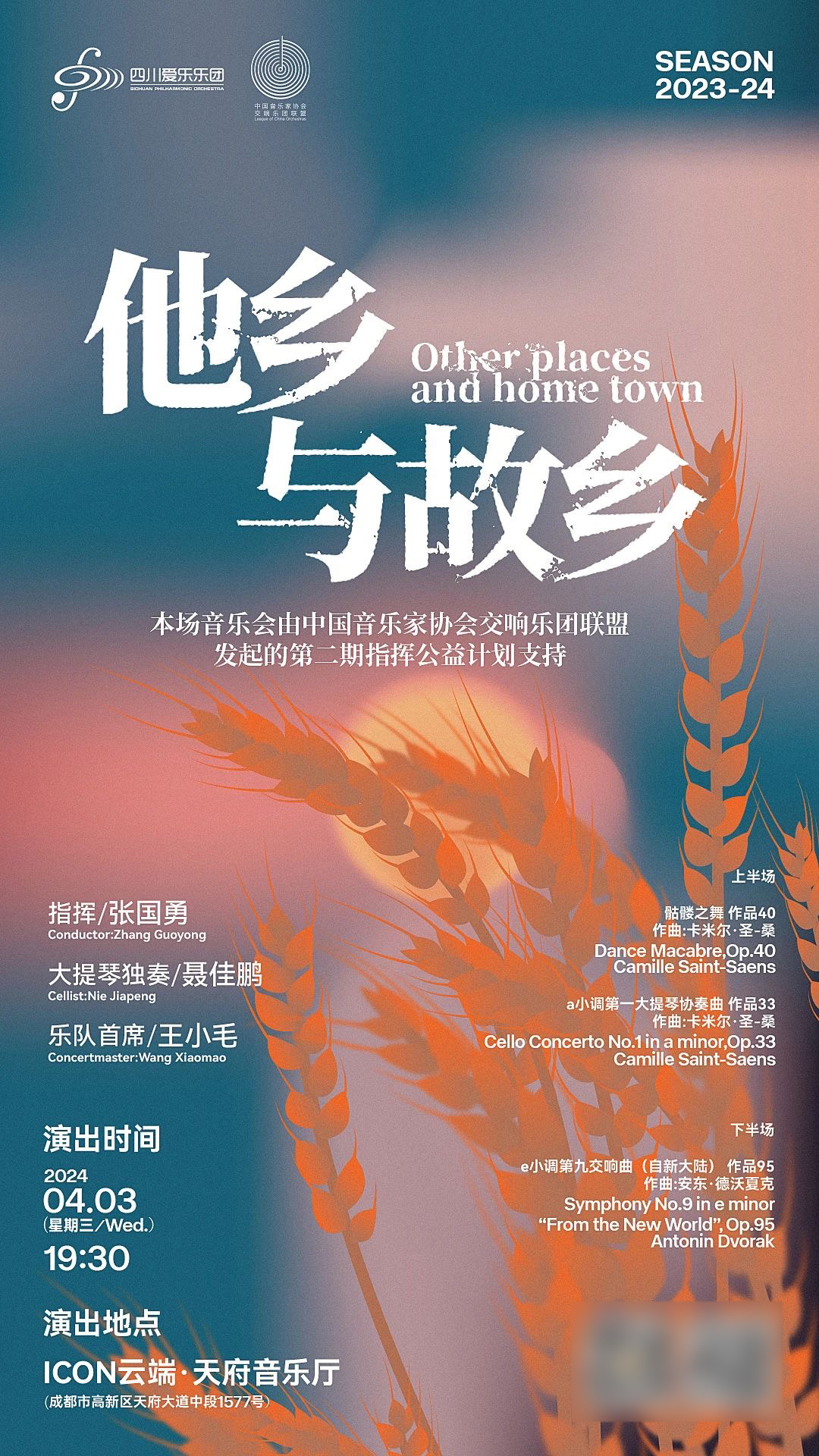 4月3日晚,四川爱乐乐团“他乡与故乡”音乐会在ICON云端·天府音乐厅上演,该音乐会由中国音乐家协会交响乐团联盟第二期指挥公益计划支持,四川爱乐乐团携手指挥家张国勇、大提琴家聂佳鹏以及来自贵阳交响乐团的音乐家,为乐迷们带来一场蕴含隽永乡愁的古典音乐盛宴。