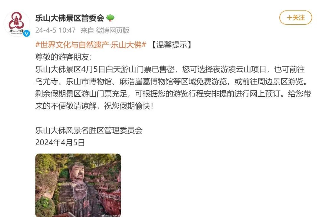 4月5日,乐山大佛景区管委会发布提示,乐山大佛景区4月5日游山门票已售罄。