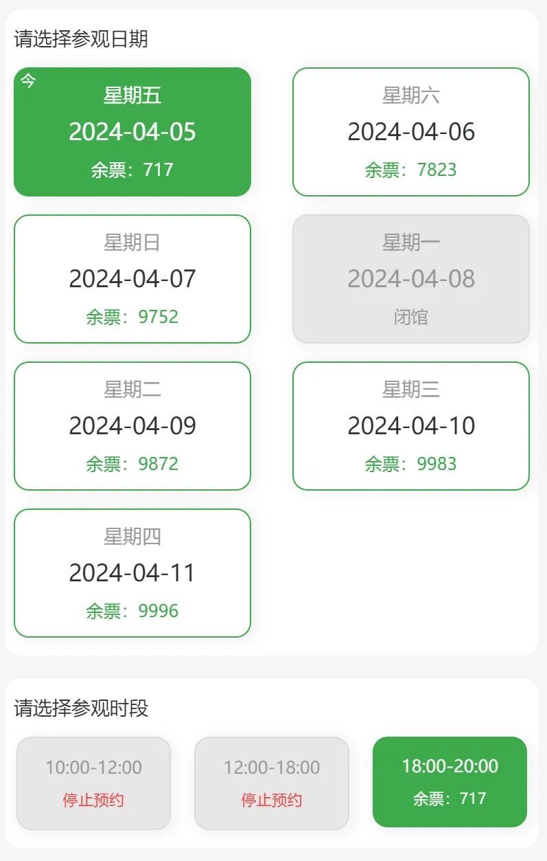 2024年4月4日、4月5日博物馆提供延时开放服务,开放时长由原08:30-18:00延长为08:30-20:00,延时票于当日下午15:00线上放票,15:30-18:00实名入馆,延时票售后不退。
