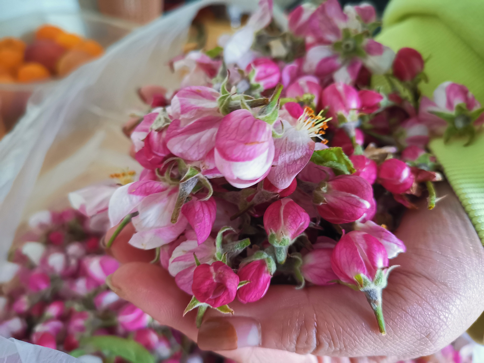 种有400多棵苹果树的许元忠,家人们都积极加入摘花队伍。往年疏掉不要的花朵,今年成了值钱的宝贝,“才4天时间,卖花挣了一千多元。”苹果园里,许元忠笑开了花。