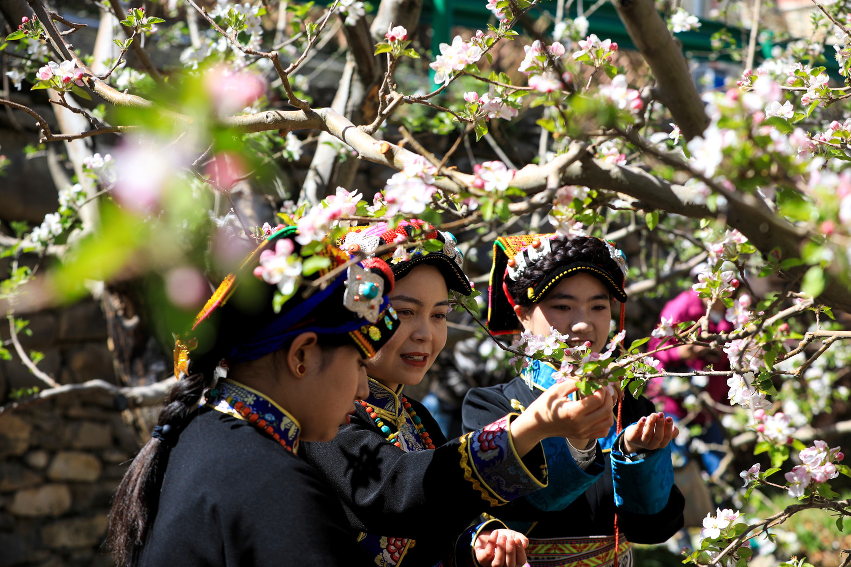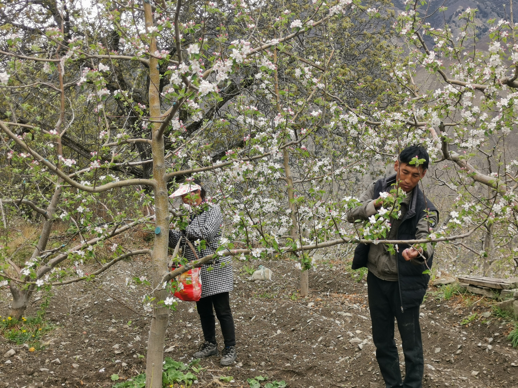 木栏村村民忙着摘苹果花。贺先强 摄