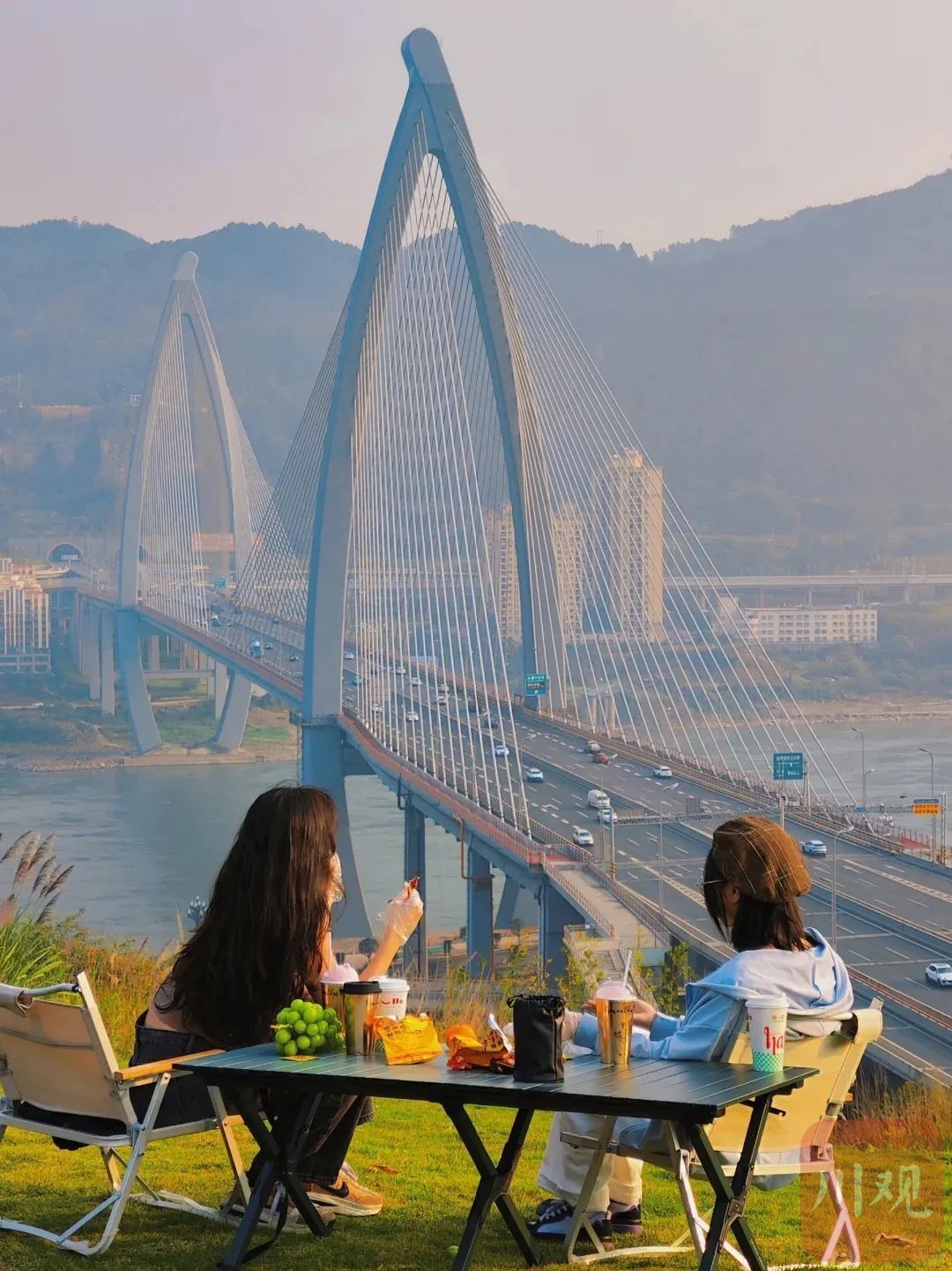 坐在挂弓山隧道上面的大草坪上,面朝江水,春暖花开。上有蓝天白云,下看盐坪坝长江大桥上川流不息,在大自然与城市人文的环绕中细细品味,是一个非常适合晒太阳发呆、拍照打卡的地方。