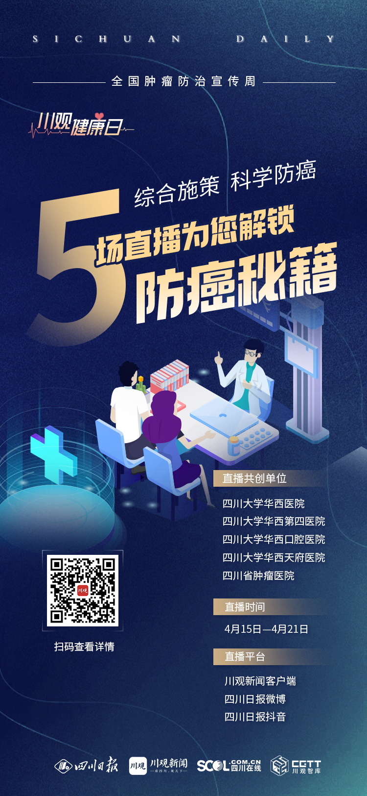 2024年4月15日—21日是第30个全国肿瘤防治宣传周,今年宣传周主题是“综合施策 科学防癌”。川观新闻联合四川大学华西医院、四川大学华西第四医院、四川大学华西口腔医院、四川大学华西天府医院、四川省肿瘤医院推出“肿瘤防治新认识”健康科普系列直播,带您解锁“防癌秘籍”。