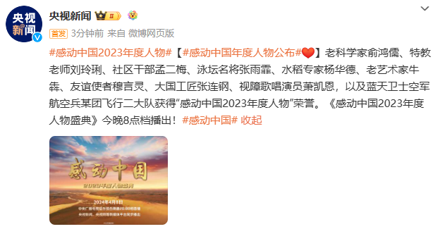 老科学家俞鸿儒、特教老师刘玲琍、社区干部孟二梅、泳坛名将张雨霏、水稻专家杨华德、老艺术家牛犇、友谊使者穆言灵、大国工匠张连钢、视障歌唱演员萧凯恩,以及蓝天卫士空军航空兵某团飞行二大队获得“感动中国2023年度人物”荣誉。《感动中国2023年度人物盛典》今晚8点档播出!