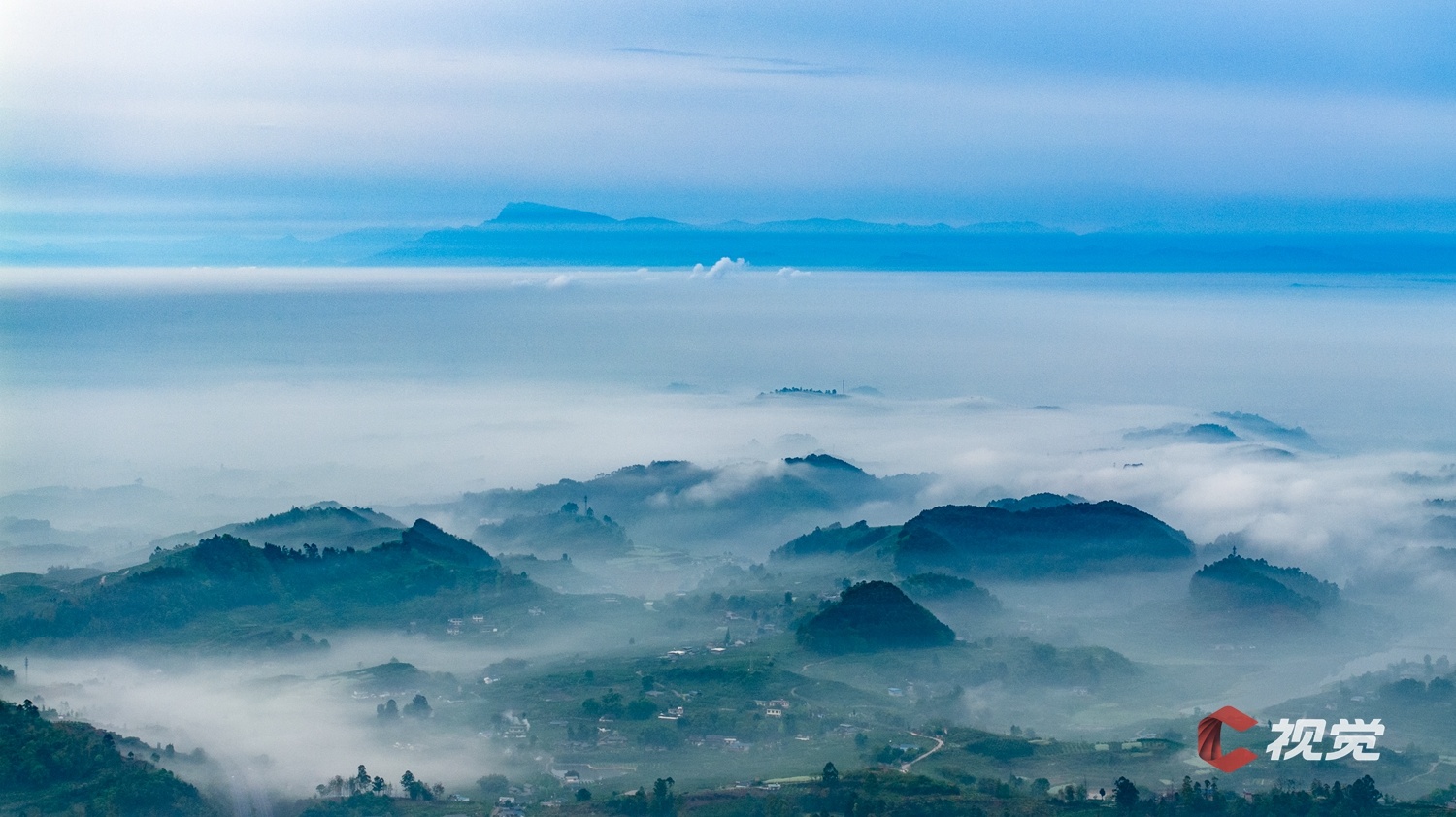 当日空气通透,能见度较高,数百公里外的峨眉山、瓦屋山等山脉清晰可见。从空中眺望远处,重重山峦与云雾层叠交织,美不胜收。
