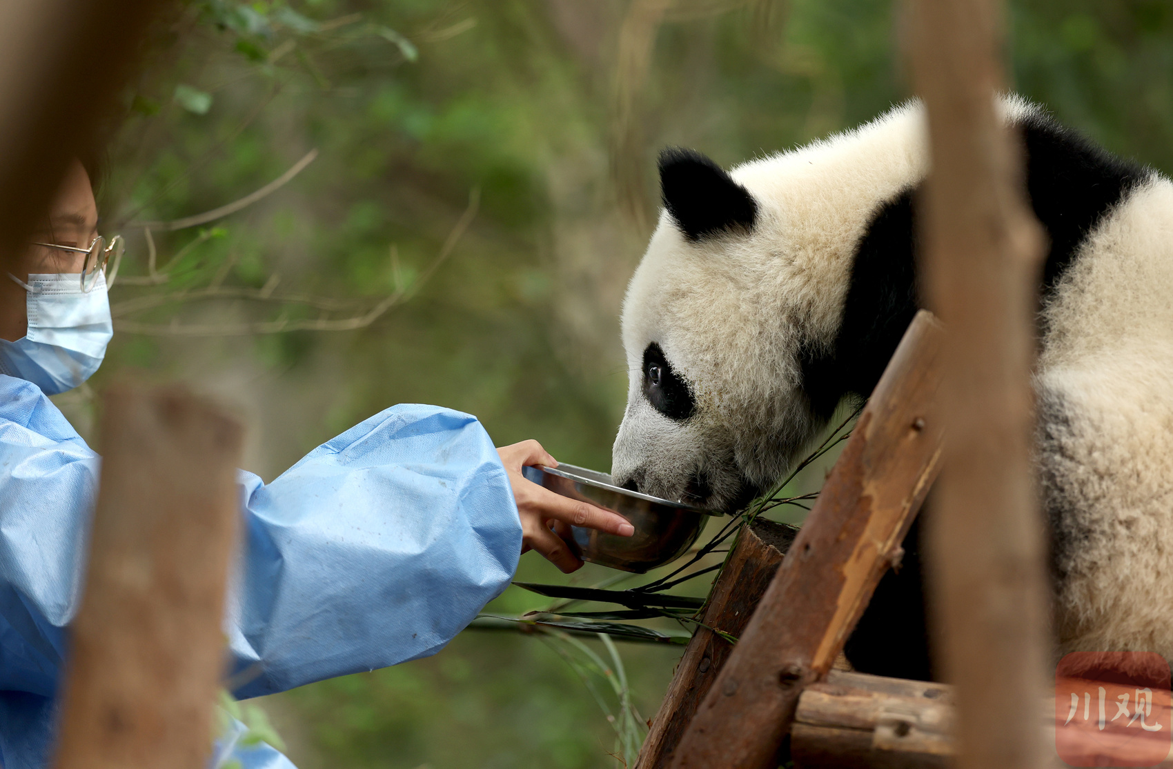 4月8日,记者在成都大熊猫繁育研究基地的月亮产房、大熊猫2号别墅,用镜头记录了大熊猫的“下午茶时间”。