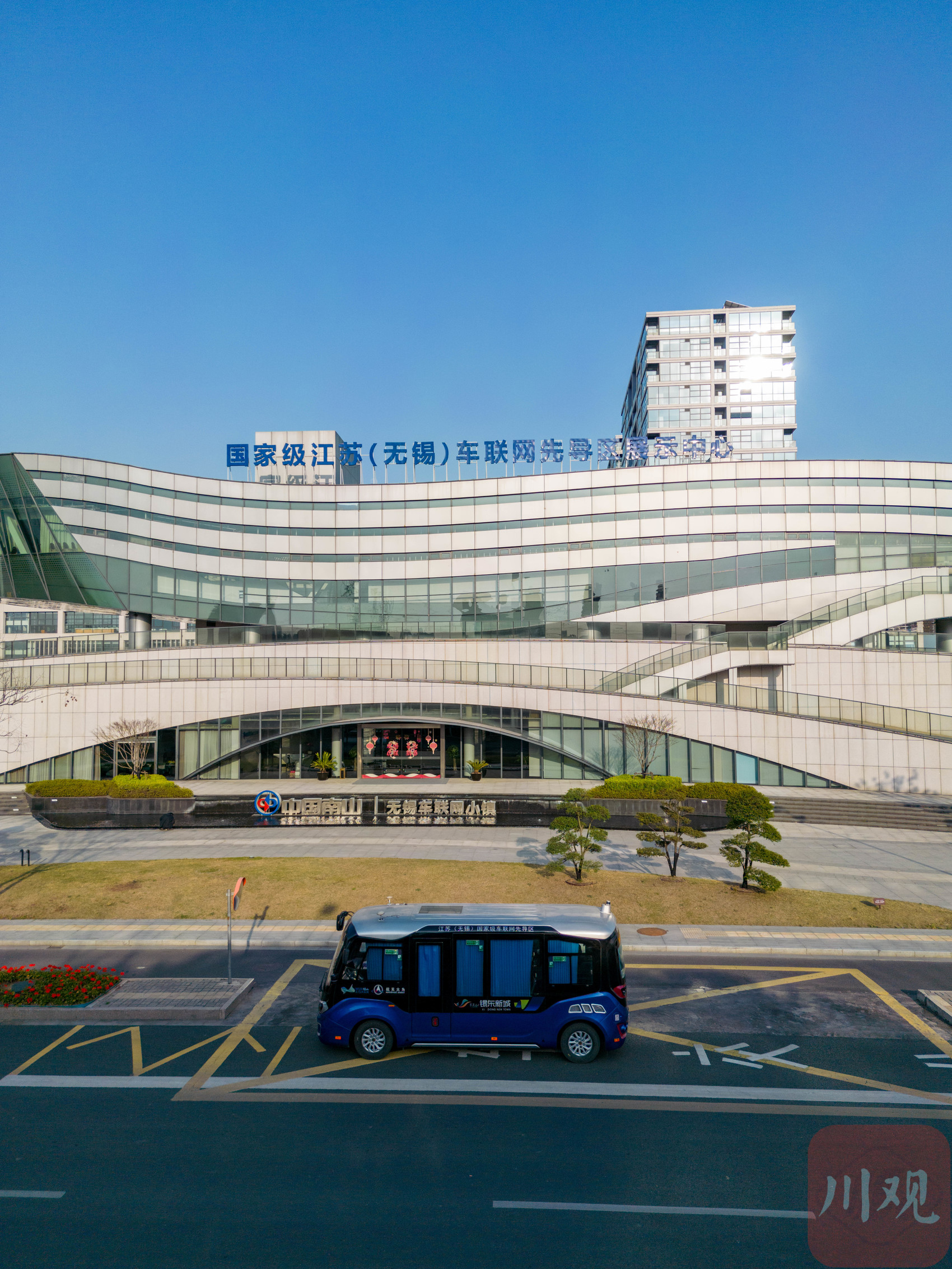 国家级江苏(无锡)车联网先导区展示中心楼前,停靠着一辆无人小巴。