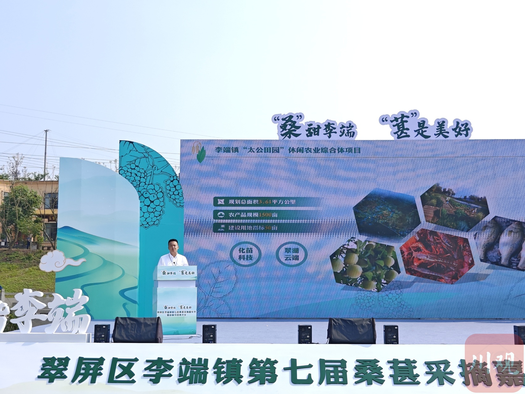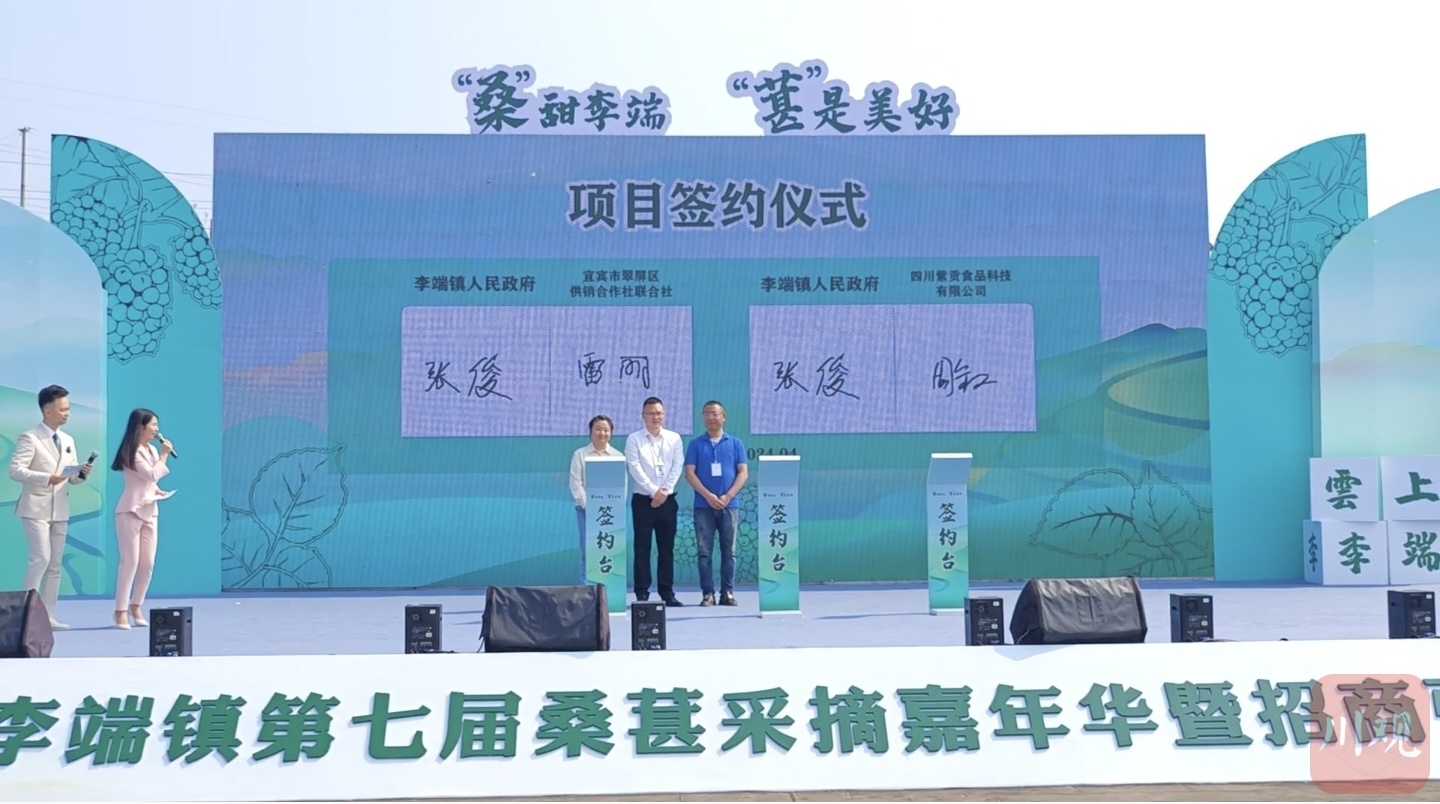 活动以“桑甜李端 葚是美好”为主题,以果为媒、以园会友。李端镇镇长易成梁担任起了推介官,为现场企业代表们推介李端特色产业,诚邀企业家投资兴业。现场,李端镇分别与宜宾市翠屏区供销合作社联合社和四川紫贡食品科技有限公司进行项目签约,助推李端镇建设天府粮仓以及实现桑葚产业从生产到加工、销售的全产业链发展。