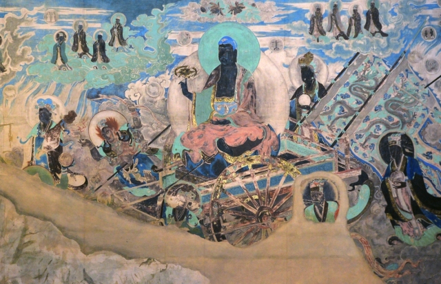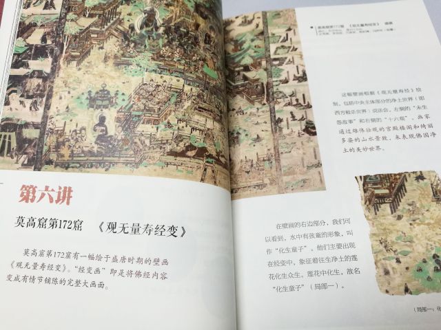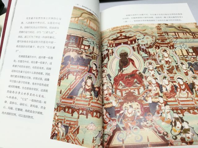 还有展现西方极乐世界之波澜壮阔、气势磅礴的,霞光紫焰中佛国世界歌舞升平,一派宏伟富丽之景象让人叹为观止(《观无量寿经变》)……