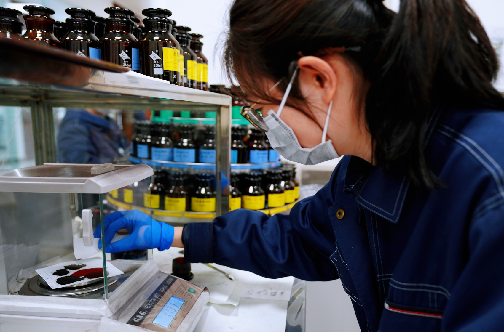 绵阳佳联(佳禧)印染有限责任公司的技术人员正在进行印染色彩的配比工作。