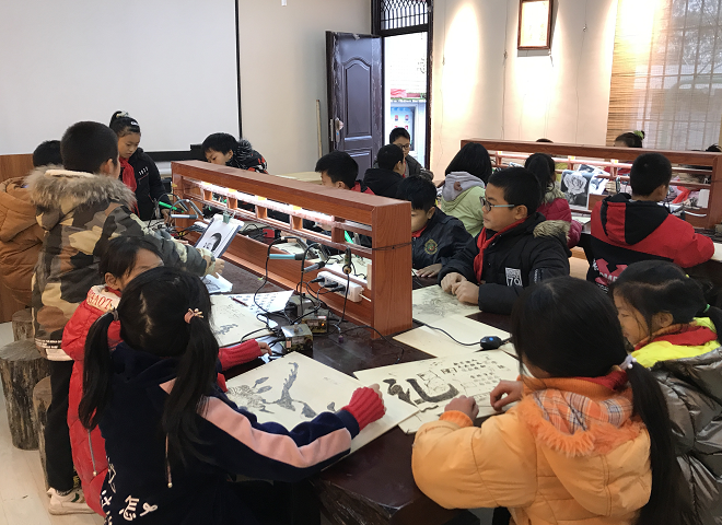 叮铃铃!下课铃声响起,一群三年级的20多位孩子涌出教室,凌家镇伏龙中心小学校的烙画室却又热闹了起来。市中区汉安烙画传承人,凌家镇伏龙中心小学校副校长高平仲仔细观看大家的制作过程,不时停下脚步,手把手地进行指导。