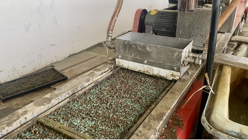 另一侧的工厂化育秧车间里,伴随着机器的轰鸣声,一个个秧盘从流水线上鱼贯而出,堆垛后由叉车送进暗化催芽车间。几天后,这批秧盘会冒出嫩芽,并被转移到育秧田中。
