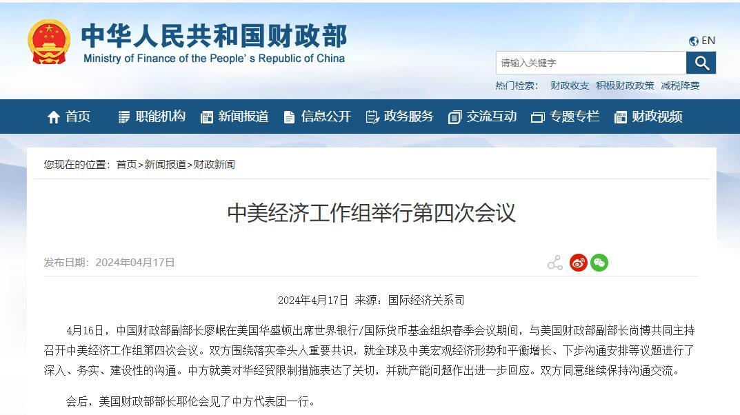 4月16日,中国财政部副部长廖岷在美国华盛顿出席世界银行/国际货币基金组织春季会议期间,与美国财政部副部长尚博共同主持召开中美经济工作组第四次会议。双方围绕落实牵头人重要共识,就全球及中美宏观经济形势和平衡增长、下步沟通安排等议题进行了深入、务实、建设性的沟通。中方就美对华经贸限制措施表达了关切,并就产能问题作出进一步回应。双方同意继续保持沟通交流。