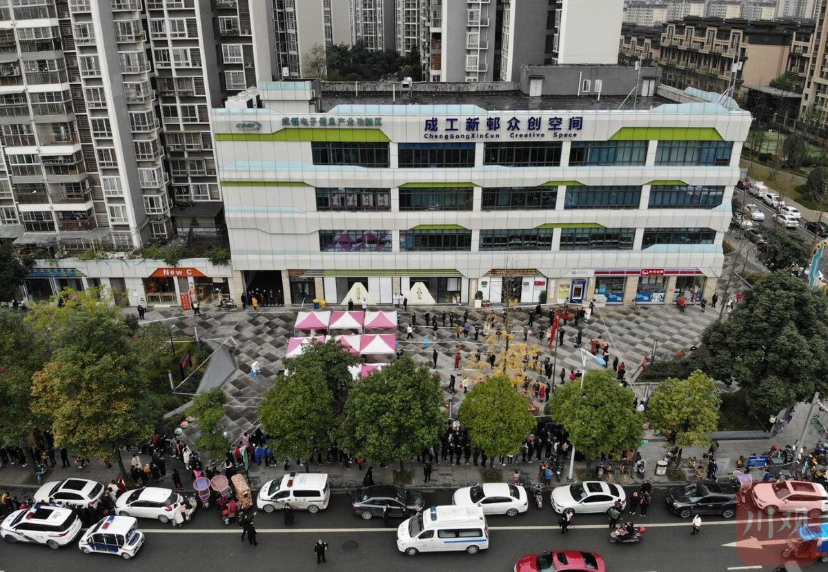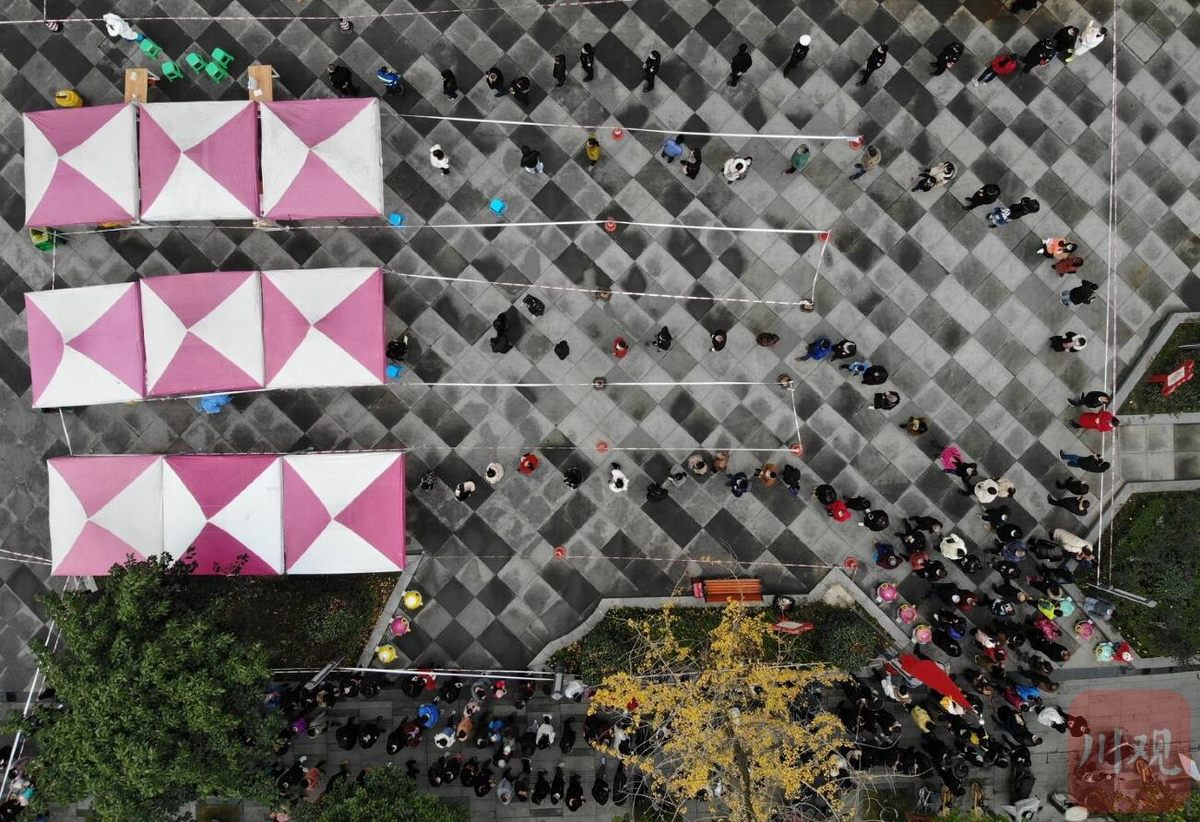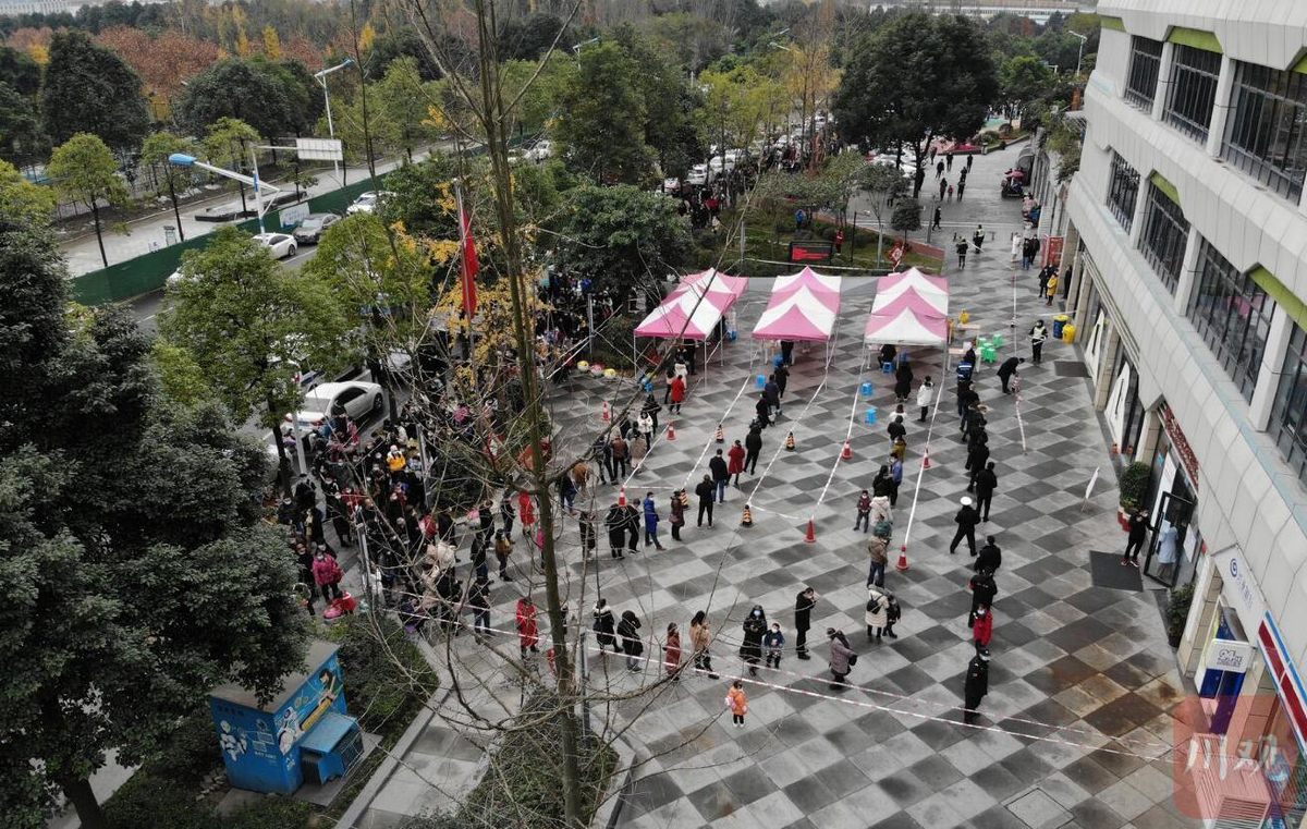 郫都区郫筒街道蜀都新邨社区党群服务中心是郫筒街道设置的两个核酸检测点之一。下午3点半,川观新闻记者在现场看到,已有数百人在此处排队接受检测,有工作人员在引导市民排队,现场秩序井然。