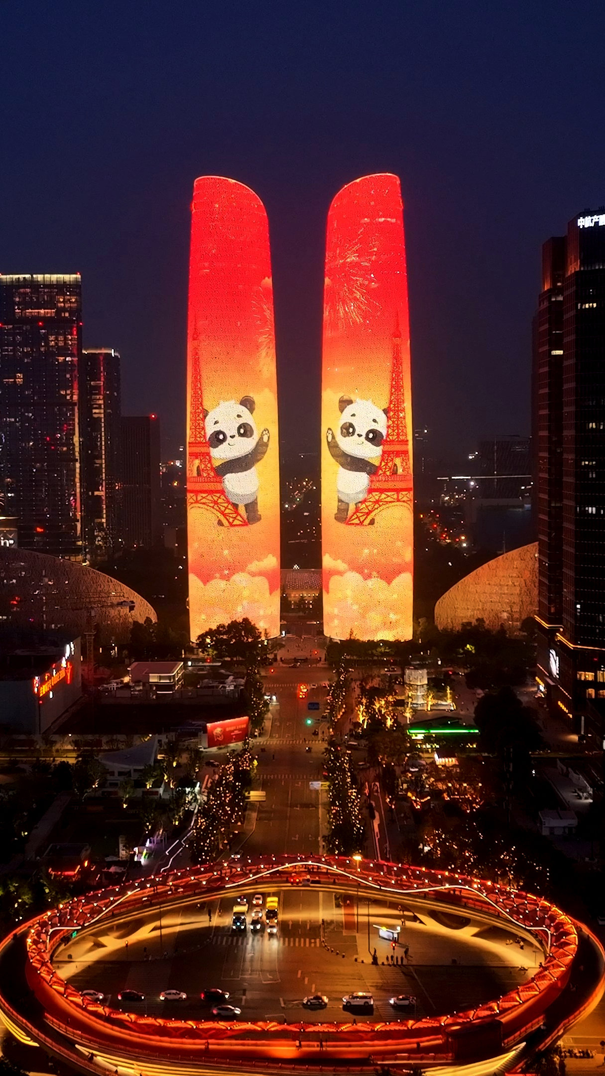 现场以中法两国国旗色为底色,连同“庆祝中国与法国建交60周年”“祝贺法国担任2024成都·欧洲文化季主宾国”中法双语字幕,以及大熊猫和埃菲尔铁塔相互映衬的画面交替点亮双塔。