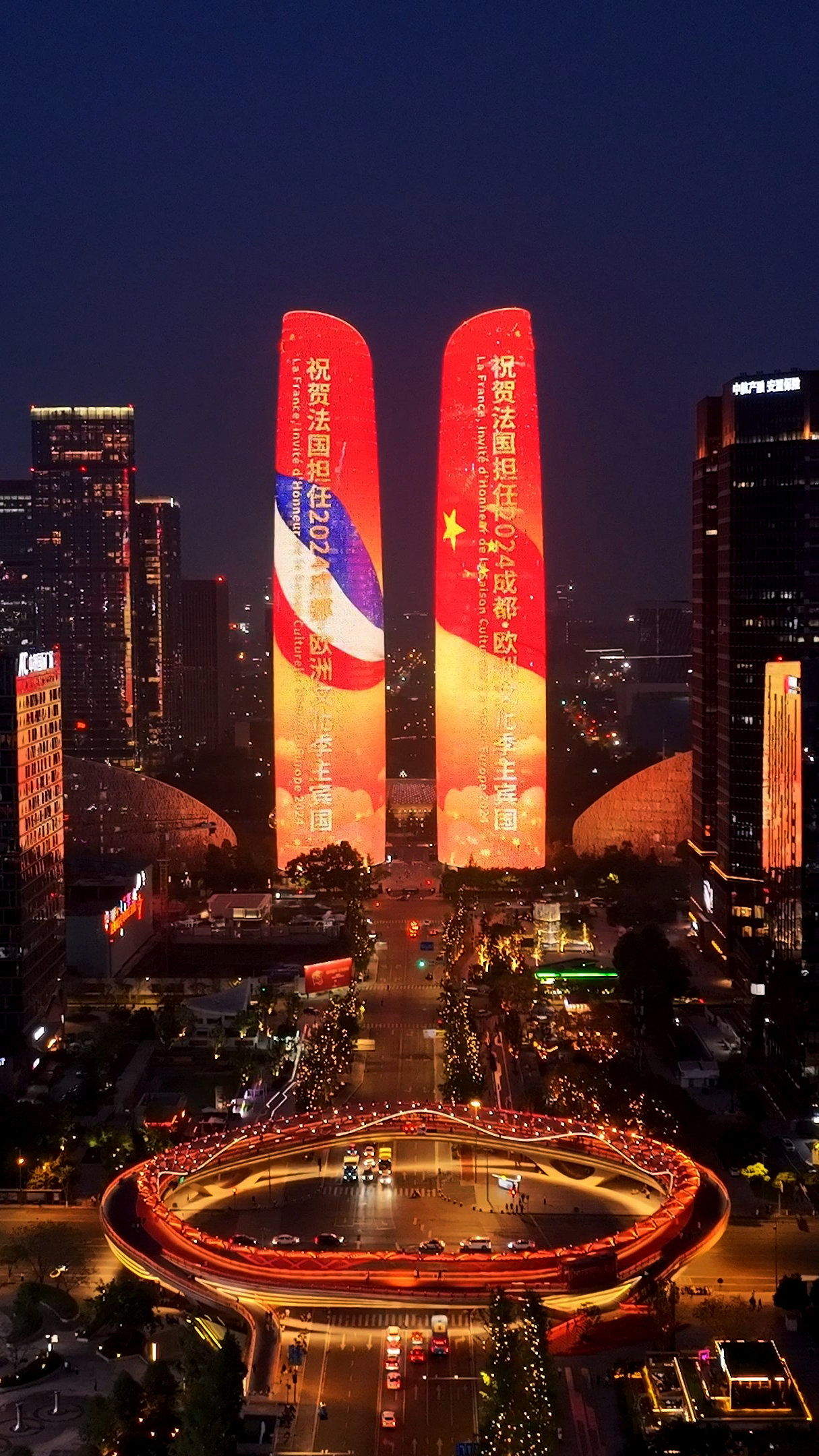 4月17日晚7点,由成都市人民政府外事办公室和成都高新区管委会共同举办的“庆祝中国和法国建交60周年亮灯仪式”在成都金融城天府双塔举行。