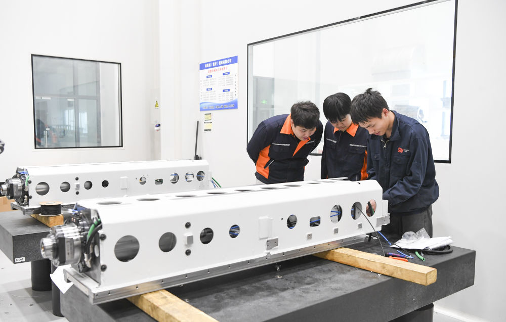 4月16日,在位于重庆市永川区中德产业园的埃斯维(重庆)机床有限公司,工作人员(右一)在向重庆城市职业学院中德产业学院学生演示作业流程。近年来,重庆城市职业学院联合德国GFM教育集团,共建中德产业学院,引入德国职业教育的先进经验,着力培养适合制造型企业需求的高素质技能技术人才。新华社记者 王全超 摄