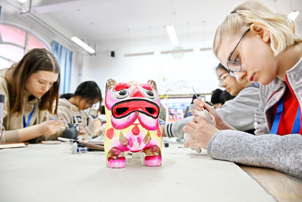 3月21日,中德学生在共同体验泥老虎彩绘。当日,在山东省青岛第九中学进行友好访问的德国马格德堡市中学生参加了一堂别开生面的传统文化艺术实践课,与中国小伙伴们一起体验非遗民俗、练习中国画基础,了解和学习中华传统文化。新华社记者 李紫恒 摄