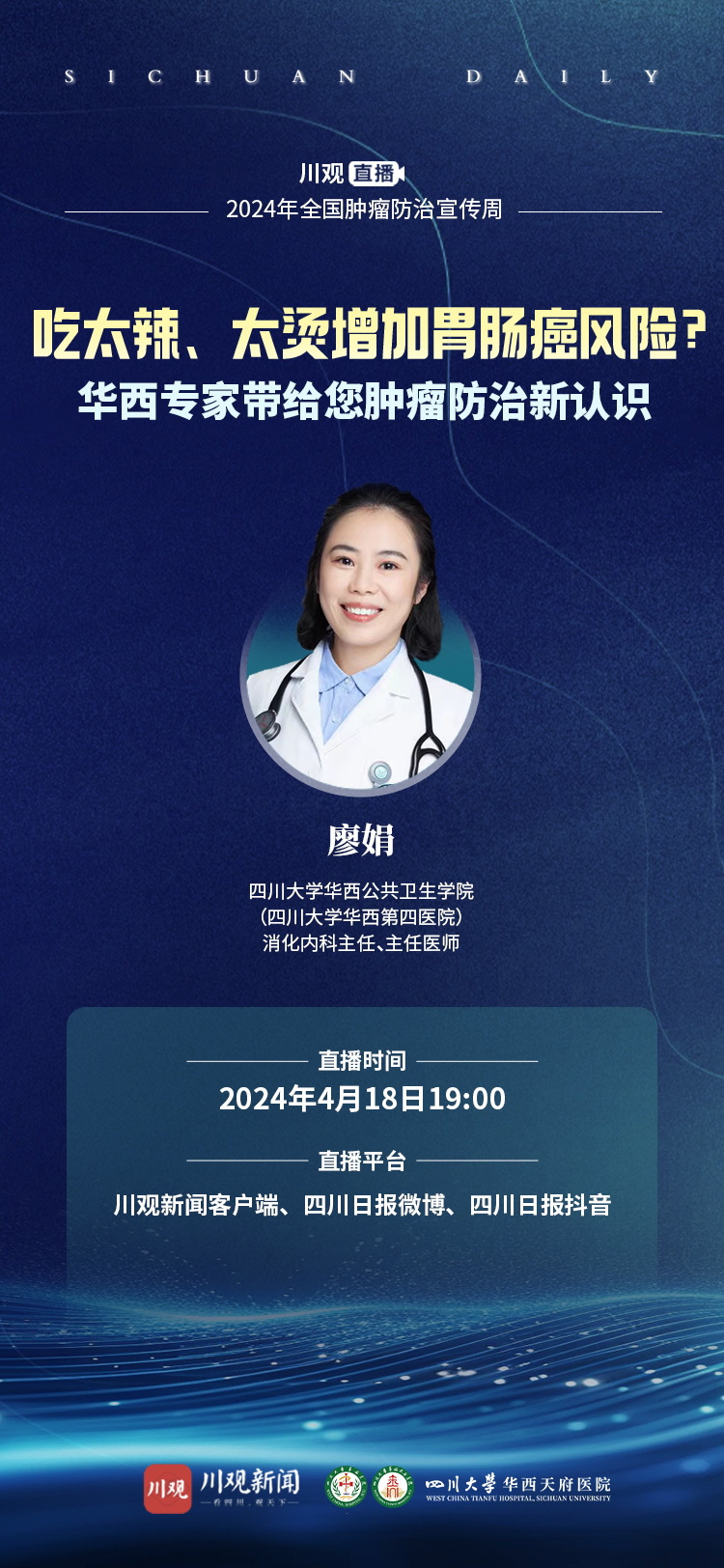 4月18日19:00,川观新闻携手四川大学华西公共卫生学院(华西第四医院)开展健康直播,专家将分享胃肠肿瘤的防治方法,讲解实用的胃肠肿瘤早筛办法,为您答疑解惑,守护健康生活!