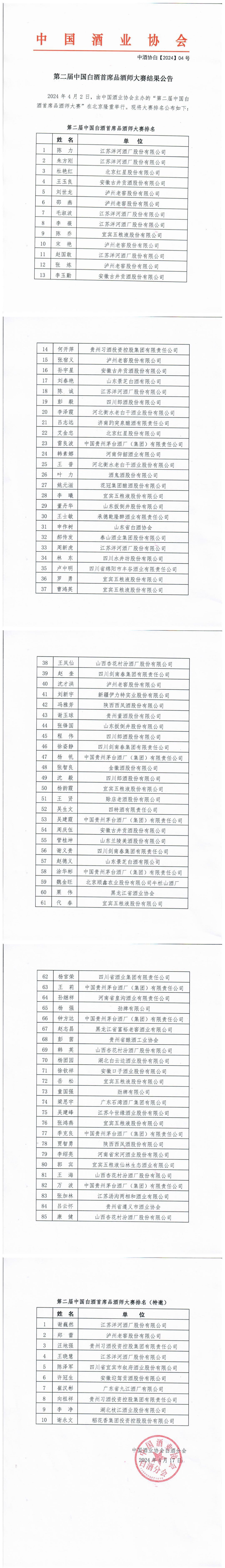下图为第二届中国白酒首席品酒师大赛结果公告↓↓↓