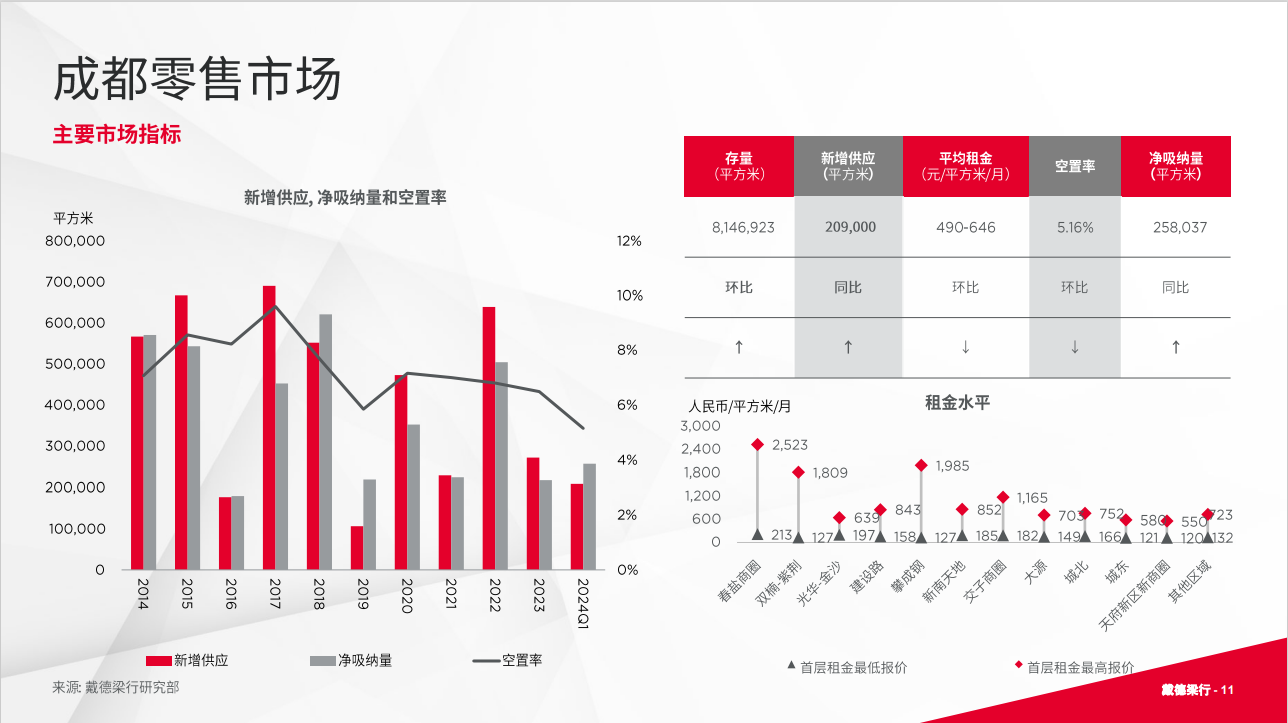 戴德梁行于4月11日发布的《2024年一季度成都写字楼与零售市场概况》报告也显示,成都优质零售物业市场一季度活跃度较高,根据数据统计,春熙路商圈销售额同比增长28.1%,客流量同比增长27.8%,销售的提高推动全市租金的正向增长。市场需求活跃,全市空置率环比下降1.34个百分点。