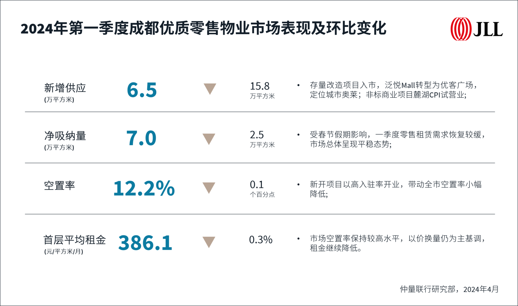 4月18日,仲量联行发布的《2024年第一季度成都商业及物流地产市场报告》指出,一季度,成都的商业零售租赁需求正在逐步恢复,改造项目的高入驻率,在开业后带动全市空置微降,非标项目打造与自然结合的独栋商业集群引领消费场景高品质创新。