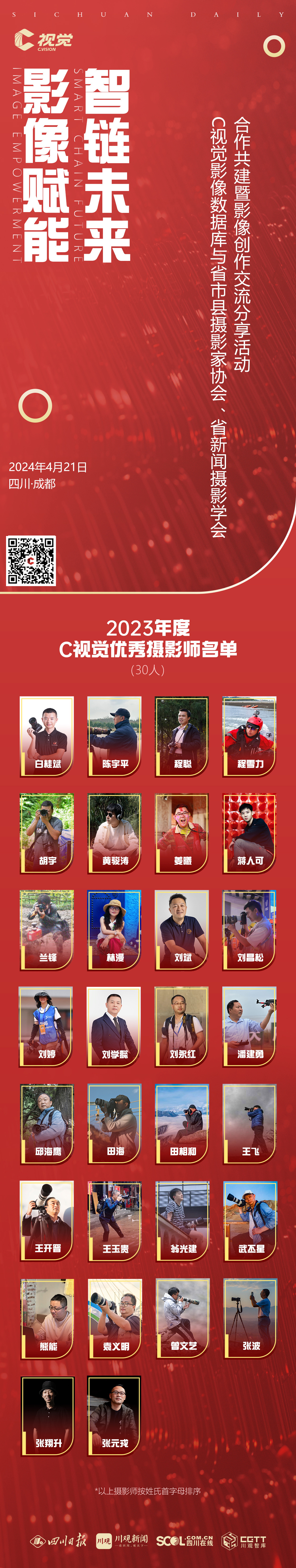 4月21日,C视觉影像数据库与省市县摄影家协会、省新闻摄影学会合作共建暨影像创作交流分享活动在成都举行。活动同步发布2023年度“C视觉优秀摄影师”名单,30名我省优秀影像创作者获得此殊荣。