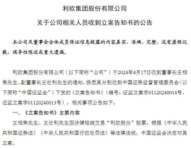 《立案告知书》内容显示,王相荣、王壮利因涉嫌短线交易“利欧股份”股票,根据相关法律法规,证监会决定对其立案。