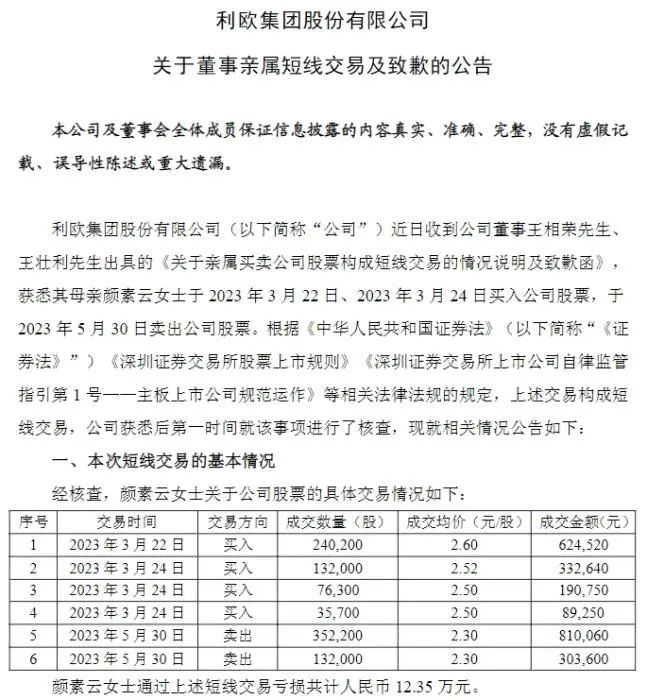 上述公告称,本次立案调查内容为王相荣和王壮利的母亲颜素云买卖公司股票事宜。颜素云于2023年3月22日、2023年3月24日买入公司股票,合计交易金额1237160元,并于2023年5月30日卖出公司股票,合计交易金额1113660元。颜素云的上述交易构成短线交易。
