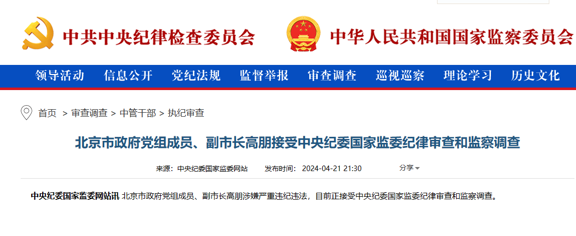 中央纪委国家监委网站讯 北京市政府党组成员、副市长高朋涉嫌严重违纪违法,目前正接受中央纪委国家监委纪律审查和监察调查。