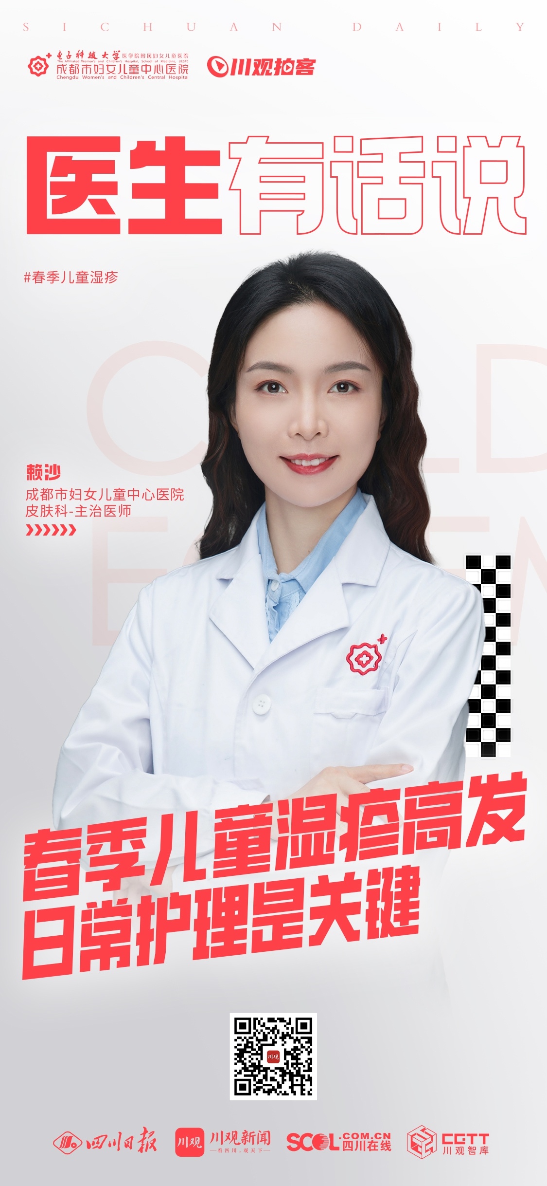本期节目,来自成都市妇女儿童中心医院皮肤科的主治医师赖沙,将与各位家长朋友们浅析春季儿童湿疹高发的原因,并分享预防湿疹的日常护理办法。