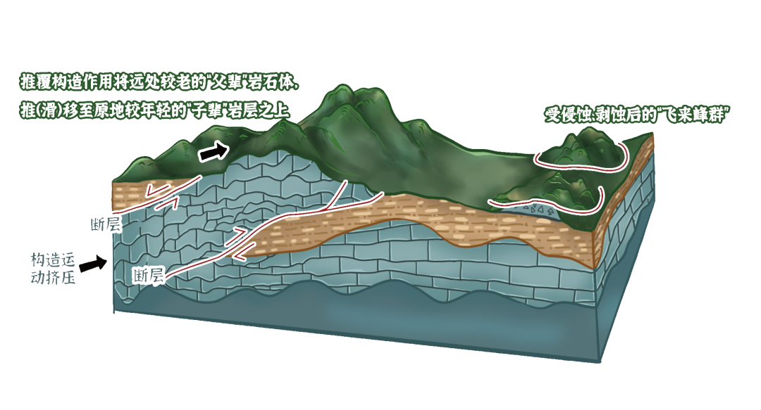 说它“飞来”是因为它们发育于著名的龙门山飞来峰,而这种“飞来峰”由强大的龙门山推覆构造从遥远的地方搬运而来。简单说,是地质力将远处较老的“父辈”地质体(岩石),推移压置在原地较年轻的“子辈”岩层之上,形成“儿子背父亲”的现象。当周围的岩石被剥蚀风化之后,从远处来的外来岩石,有可能孤零零地保留在异地,它们如无根之萍,仿佛天外飞来,故名飞来峰。