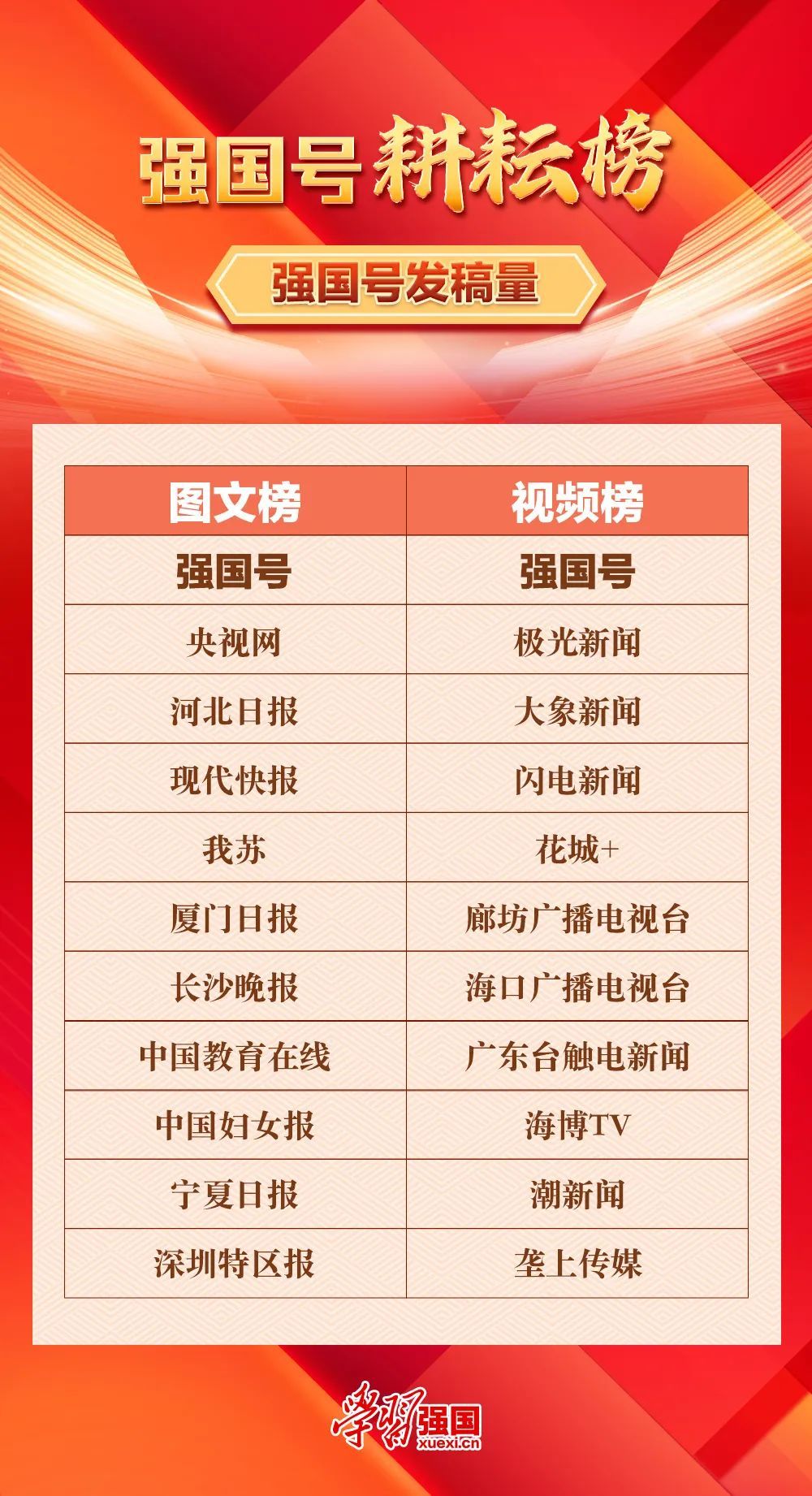“耕耘榜”以强国号发稿量为数据支撑,上榜强国号凭借媒体资源优势,围绕时政、民生、经济、健康、文旅等多个领域,为平台和用户提供了丰富的原创精品内容。