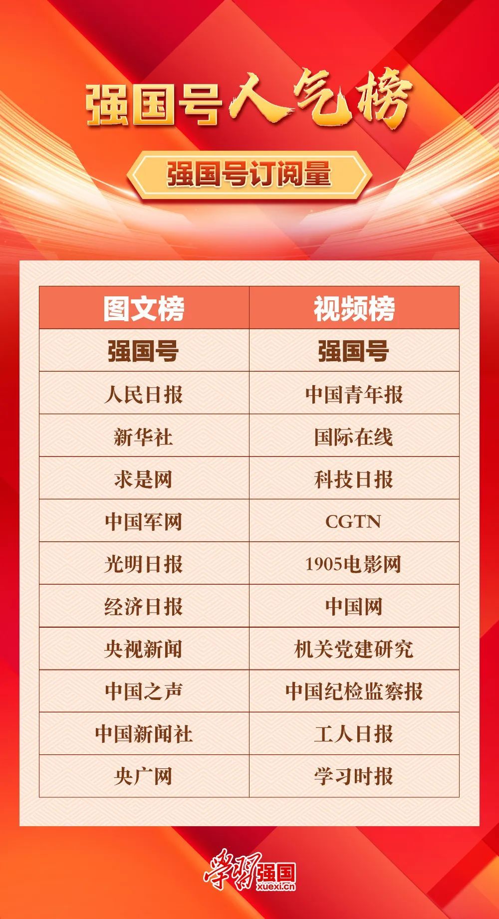 “人气榜”以强国号订阅量为数据支撑,上榜的强国号广受用户欢迎,订阅量高,展现了权威性、公信力、影响力。
