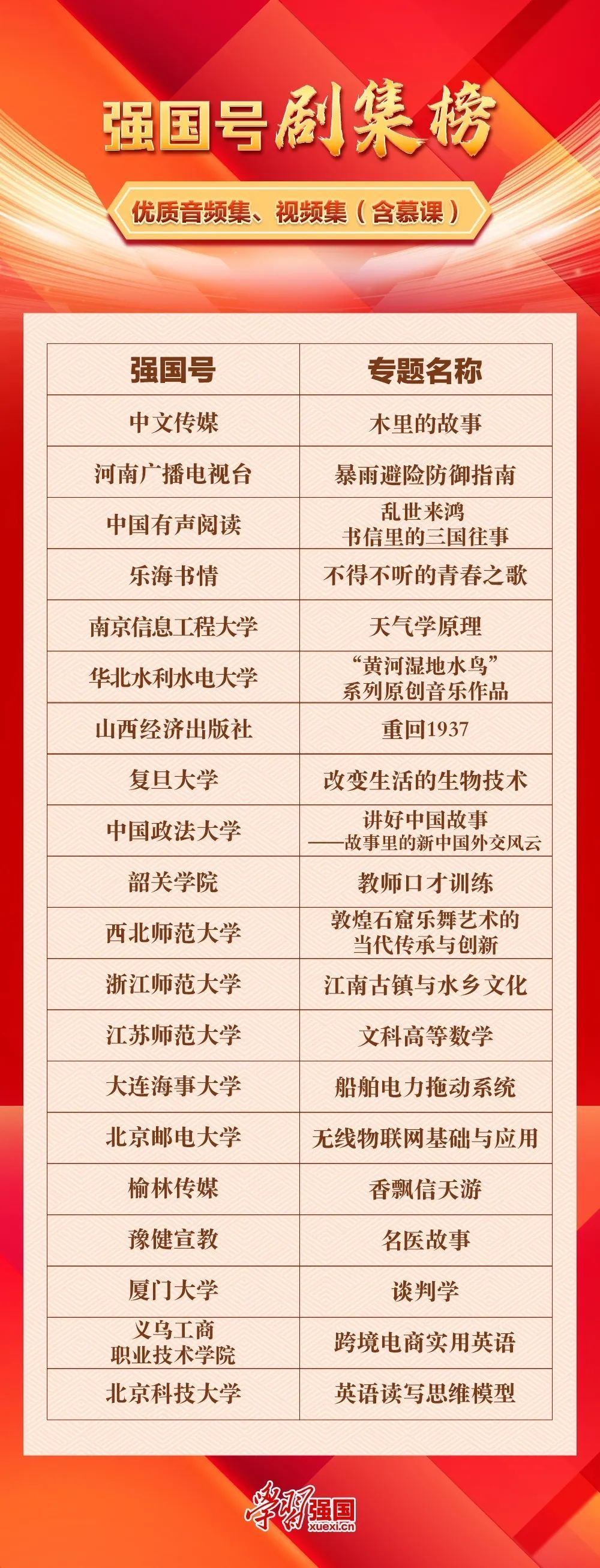 “剧集榜”以强国号发布的优质音频集、视频集(含慕课)阅读量为数据支撑,选题内容独具匠心,以专业优质的音视频作品,为用户提供了多场知识盛宴,收获读者喜爱。