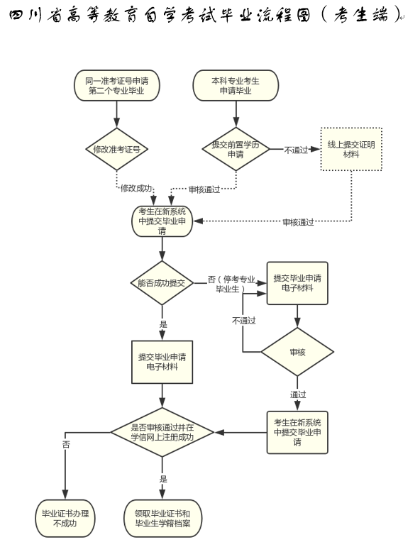 考生在信息系统(网址:https://zk.sceea.cn)中按需提交前置学历审核或毕业申请,提交毕业申请后还需于2024年5月24日前向准考证号所属县(市、区)招生考试机构邮箱(附件2)或主考学校邮箱(邮箱地址详见院校相关公告)提交拍照或扫描清晰完整的电子申请材料进行初审(毕业申请流程图见下图)。