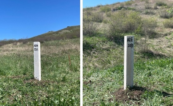△左为亚美尼亚界桩,右为阿塞拜疆界桩