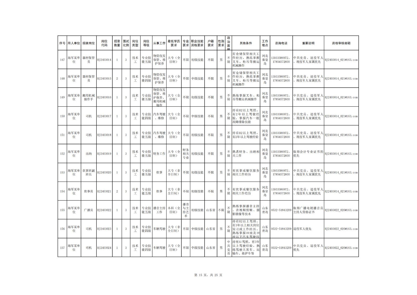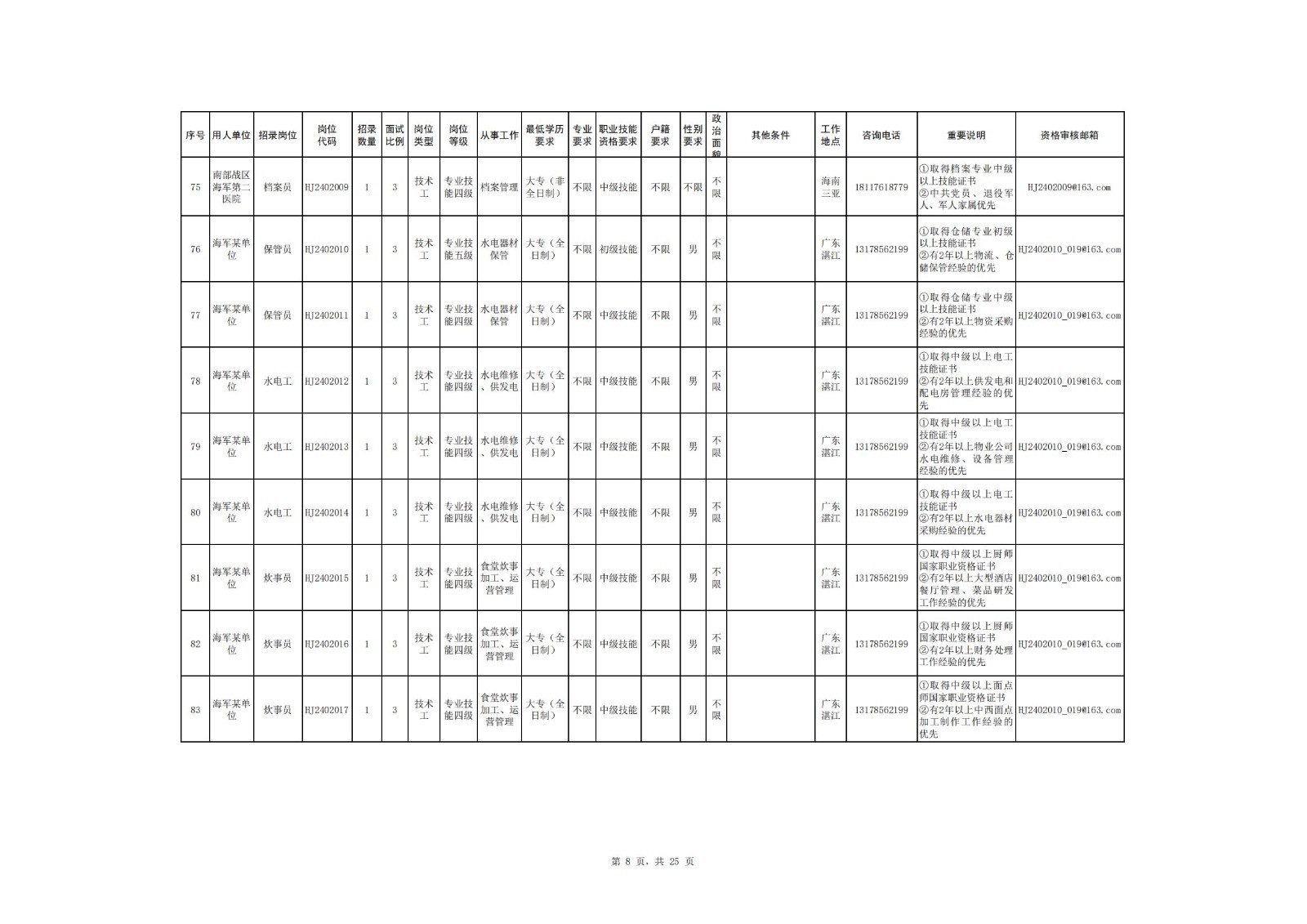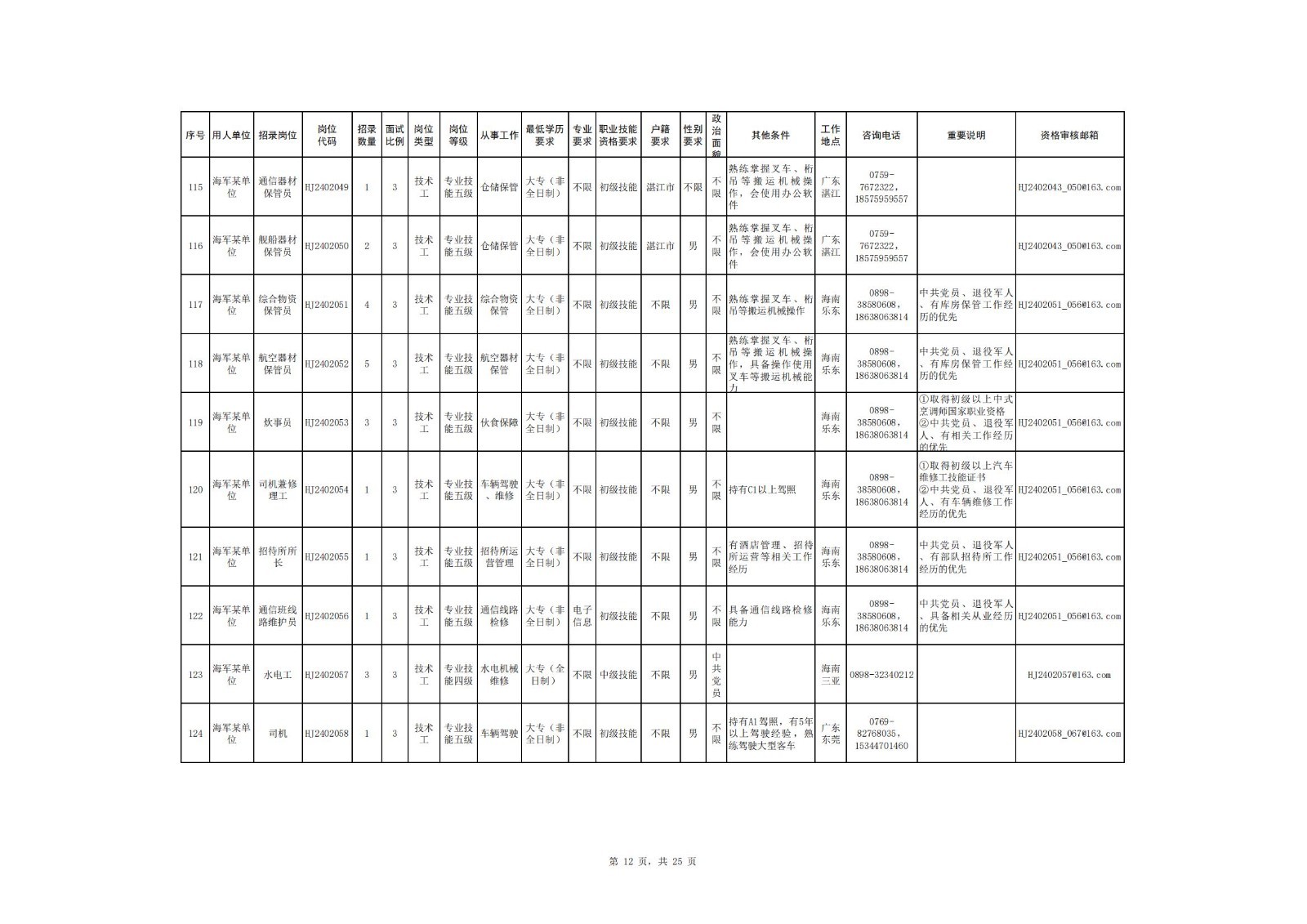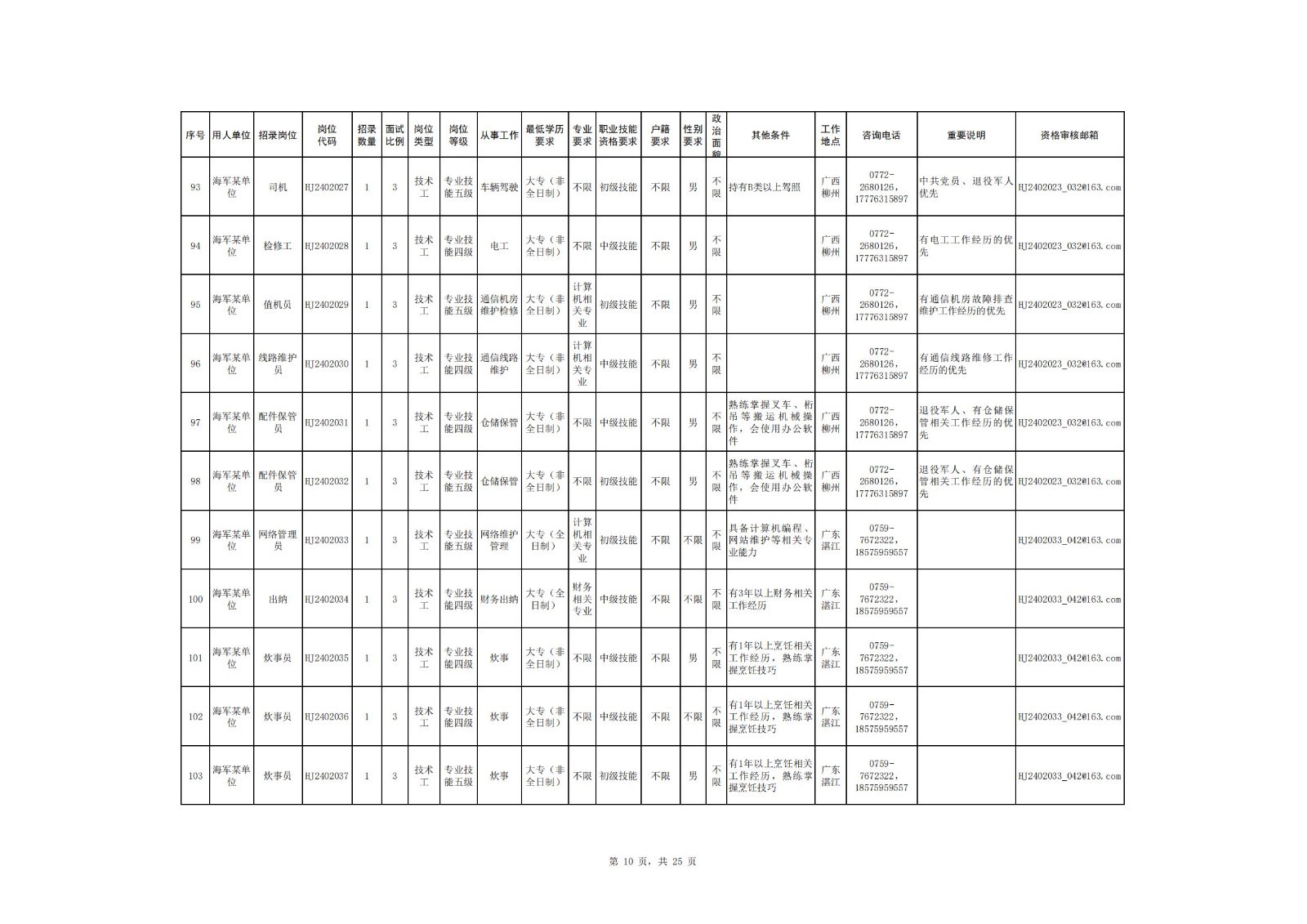 海军相关单位从事装备维修、物资器材存储、后勤保障、文化服务等工作的技术工岗位。