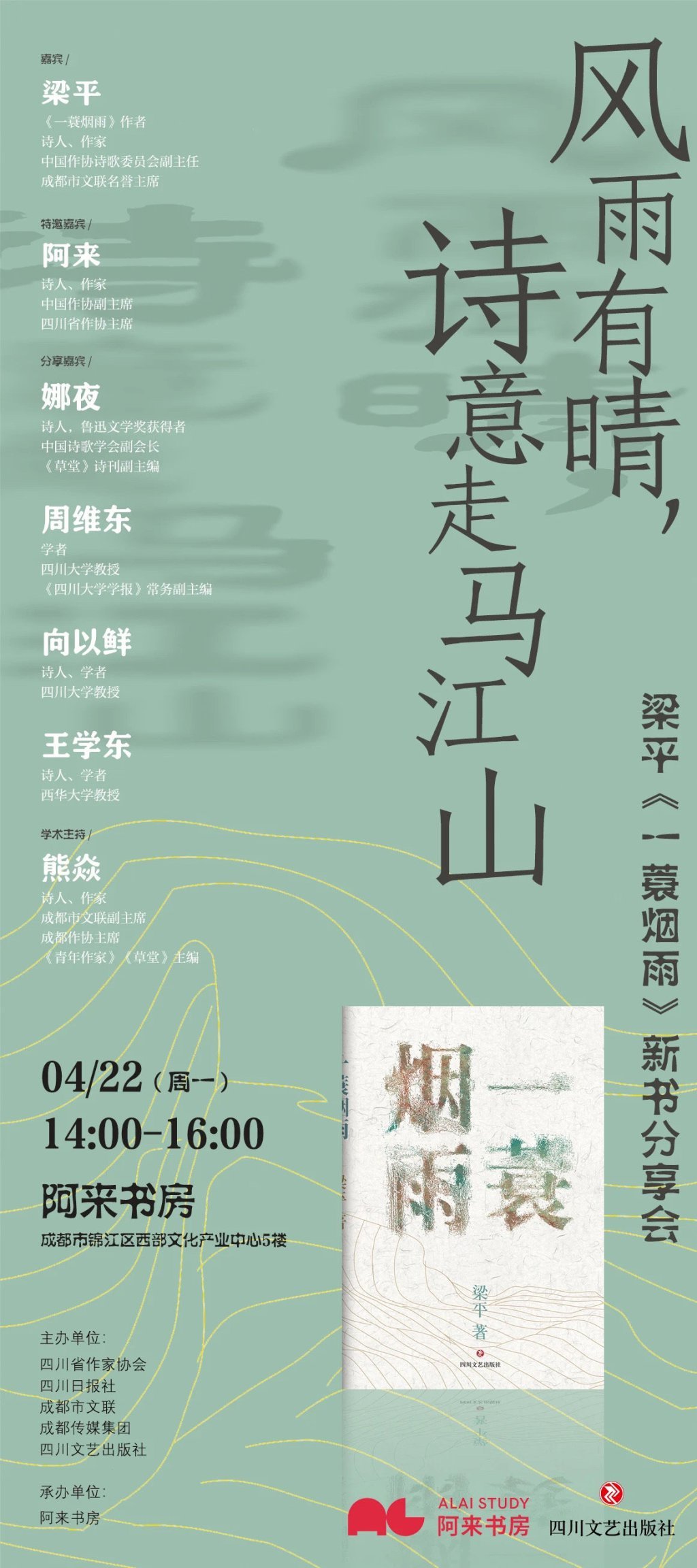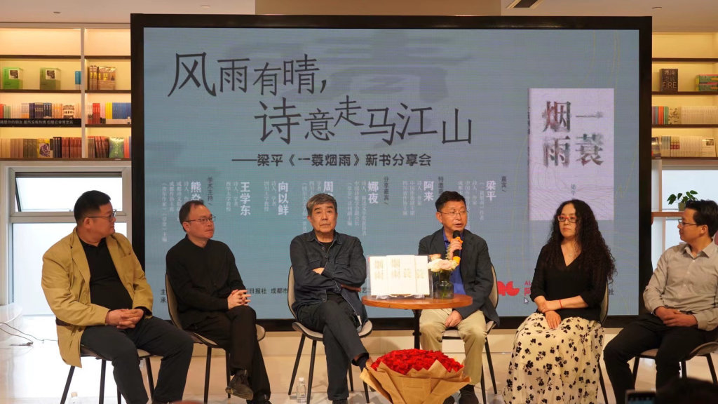 4月22日,第29个世界读书日前一天。“风雨有晴,诗意走马江山——梁平《一蓑烟雨》新书分享会”在阿来书房举行。梁平与他的朋友们,包括作家阿来,诗人娜夜,四川大学教授周维东、向以鲜,西华大学教授王学东等嘉宾展开漫谈,在梁平建构的“诗”界里,寻找“一蓑烟雨任平生”的从容豁达。