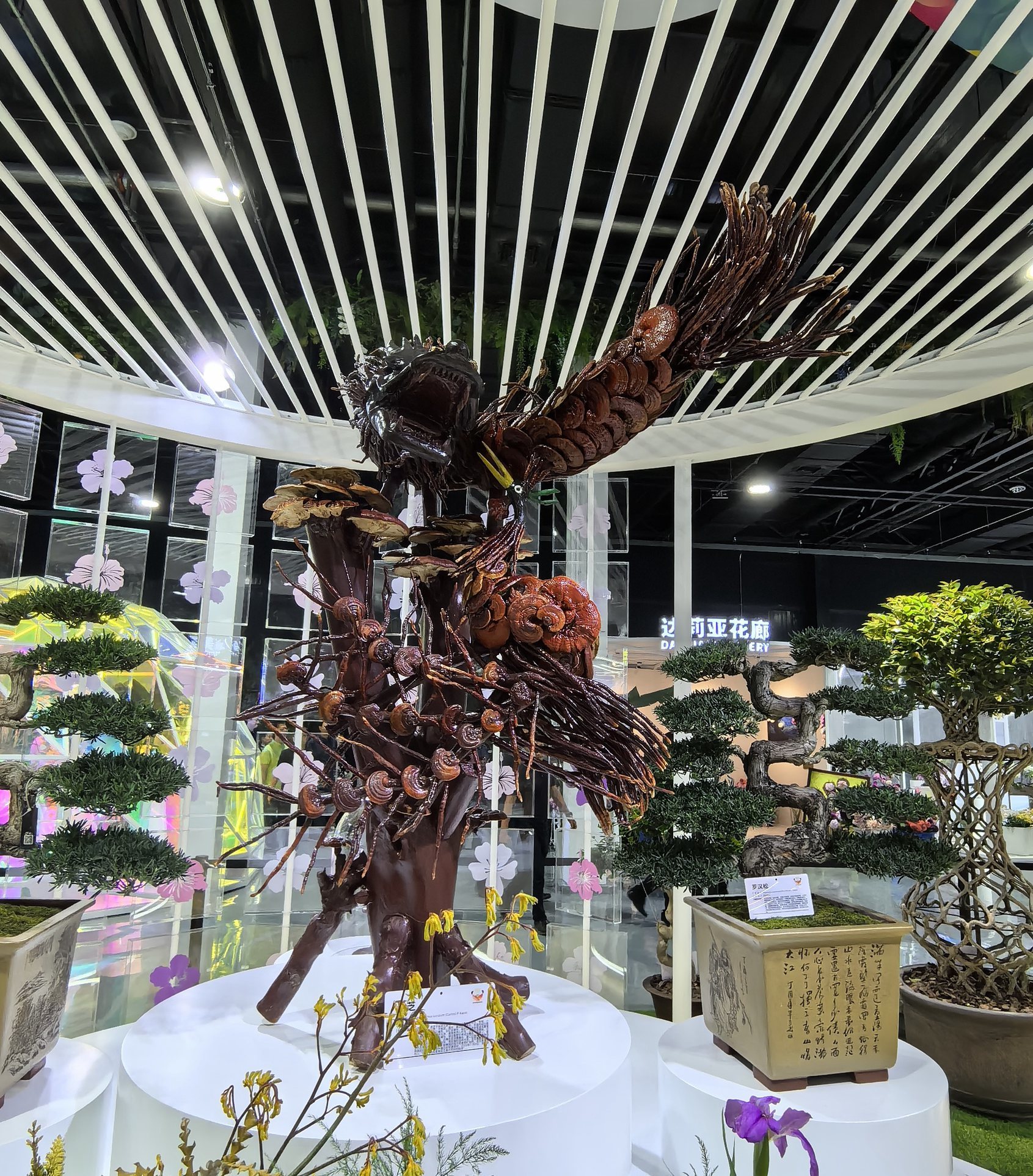 其中,一个用灵芝做的“龙凤呈祥”组合盆景特别引人注目。“龙凤呈祥,川派盆景代代相传。”作品设计者、郫都区花卉协会副会长曾开成说,今年是龙年,为了表达积极向上的精神,他们用食用菌之王——灵芝制作了龙凤呈祥,体现中国龙文化,左右两边配了川派盆景的一对方拐,下部用传统插花艺术体现“绿水青山就是金山银山”的理念,为世园会的成功举办献上祝福。