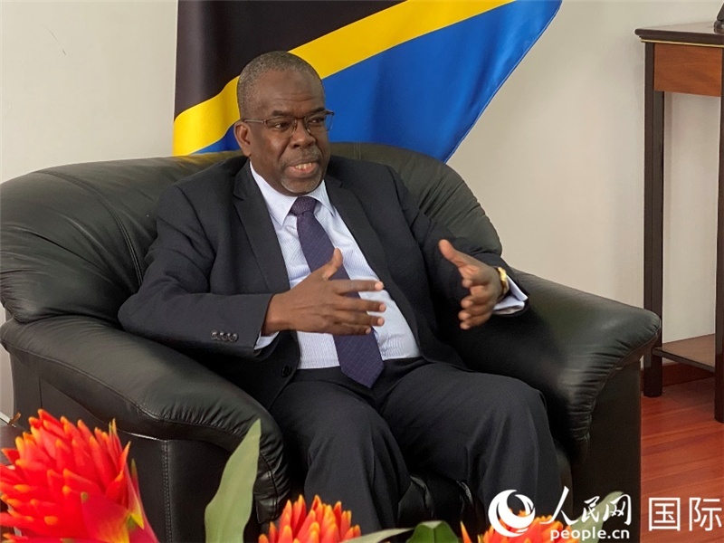 坦桑尼亚驻华大使哈米斯·奥马尔正接受采访。人民网 宋歌摄