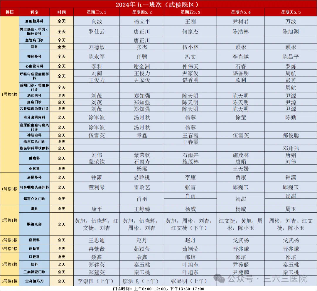 为满足患者就诊需求,方便大家提前做好假期安排,五一期间门诊安排如下