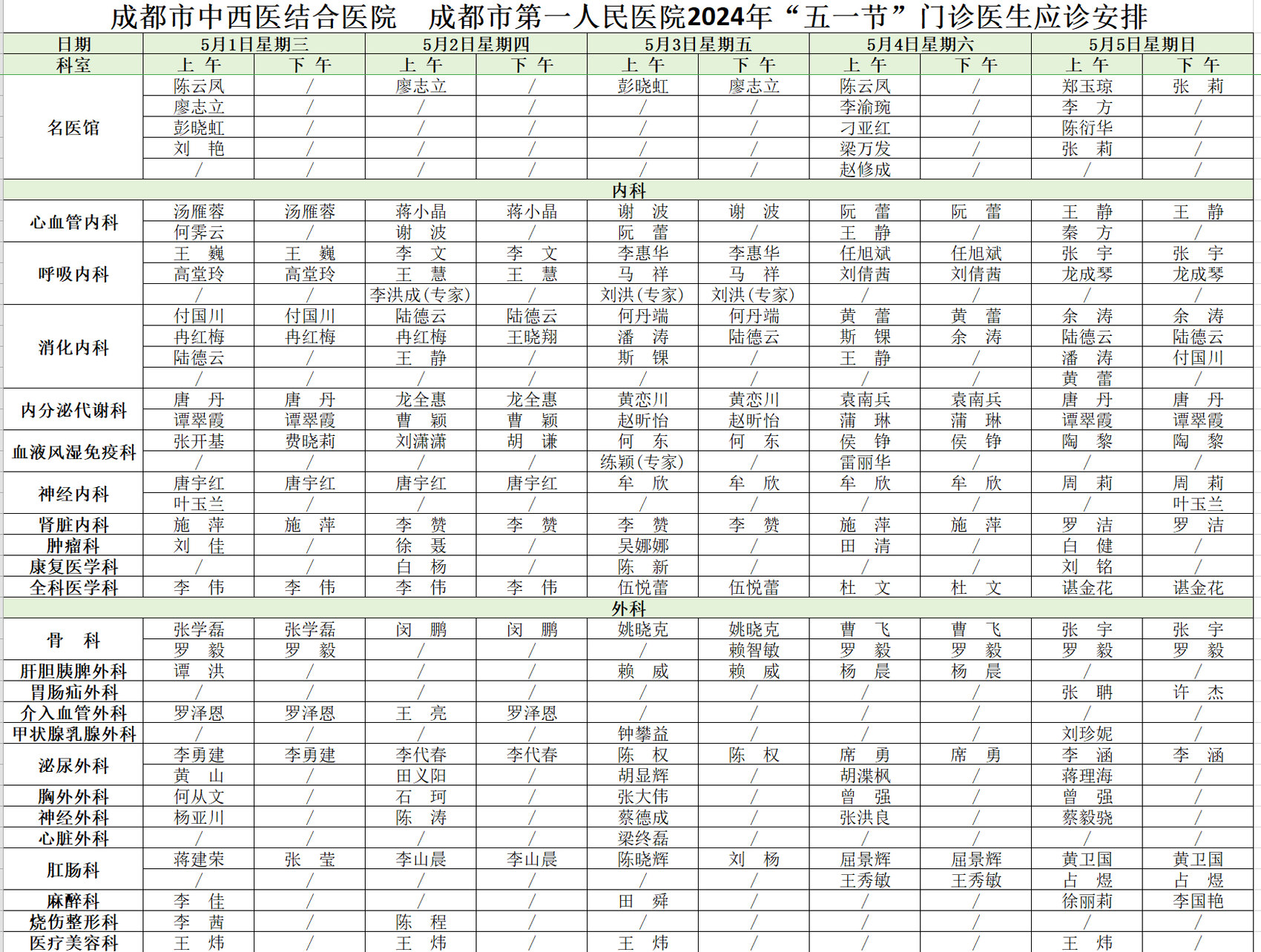 2024年劳动节(主院区、温江院区)门诊安排如下:
