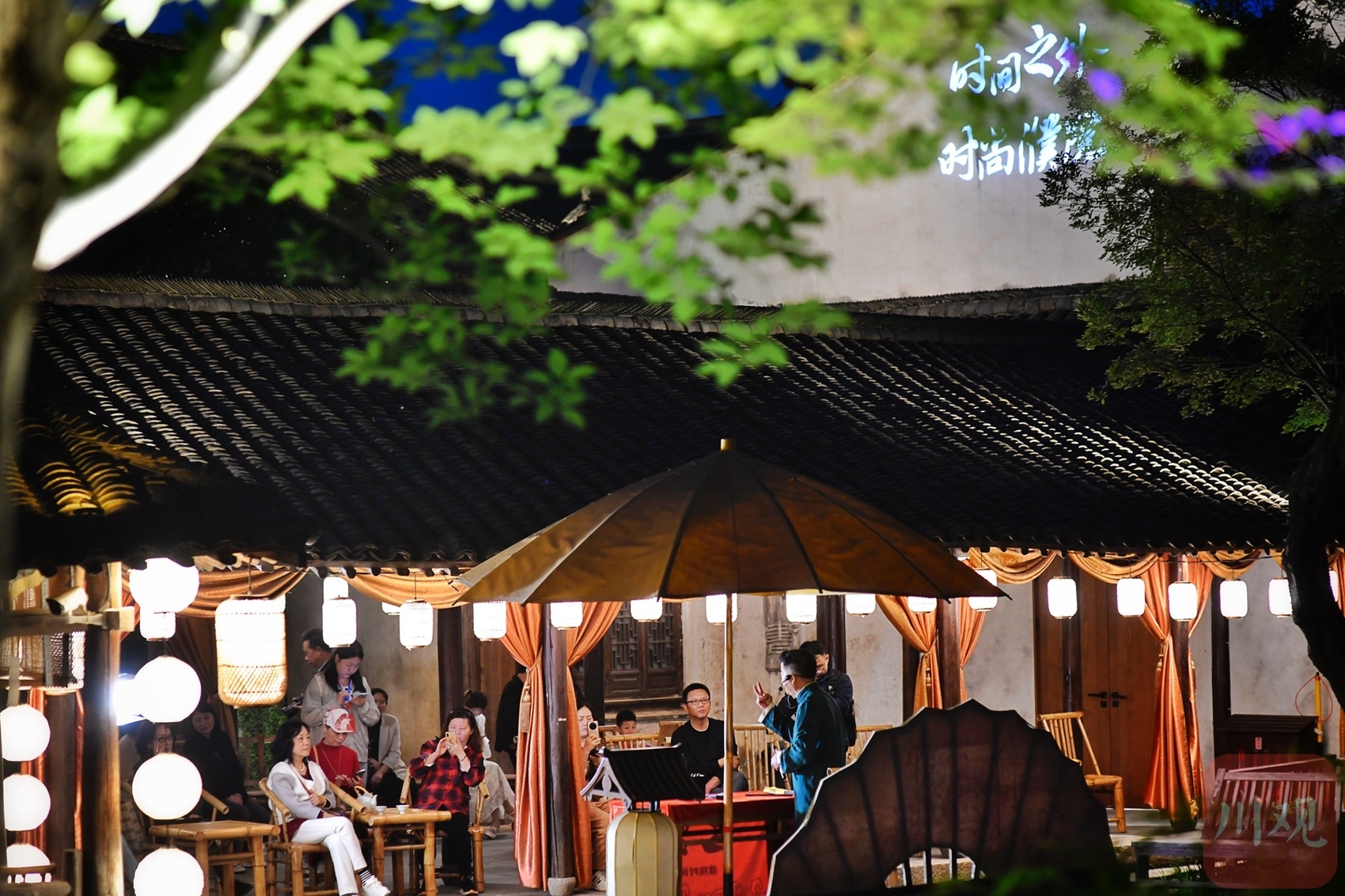 4月26日,游客们夜游濮院古镇,听书桐乡三跳。
