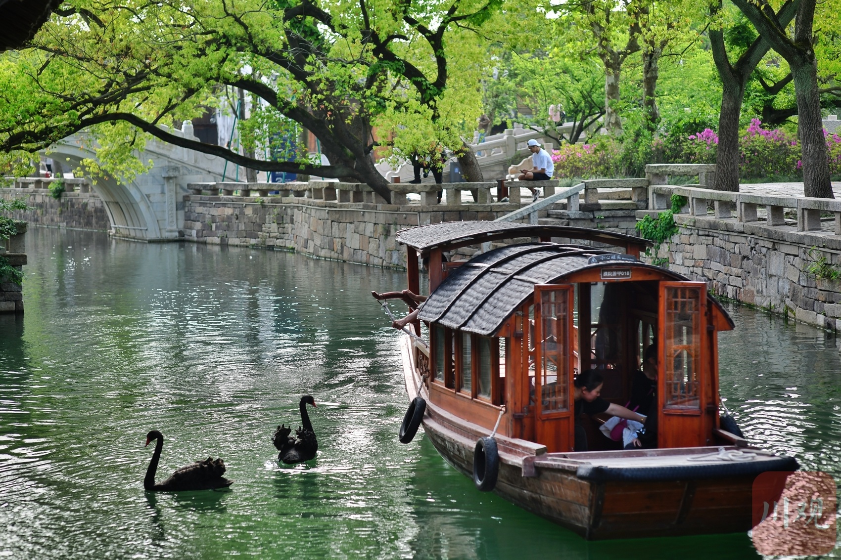 摇曳的乌篷船,翩翩起舞的黑天鹅,小镇里岸绿景美。