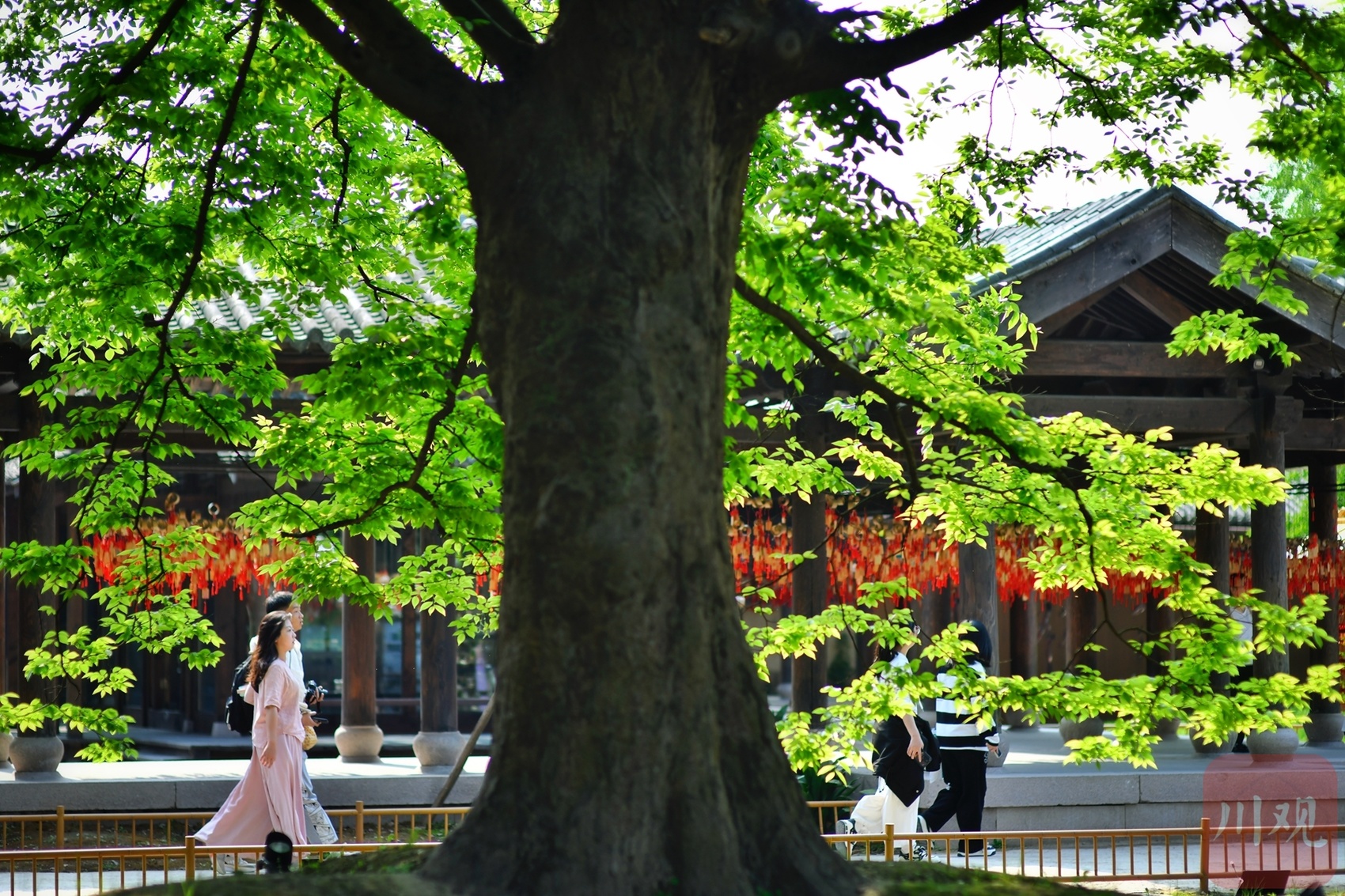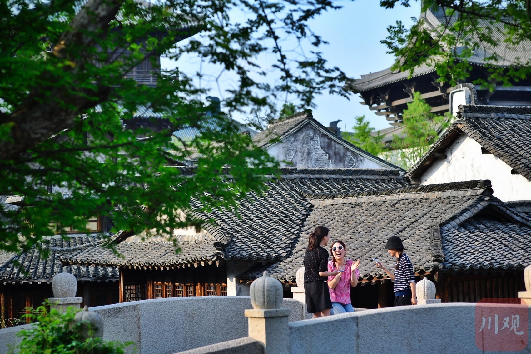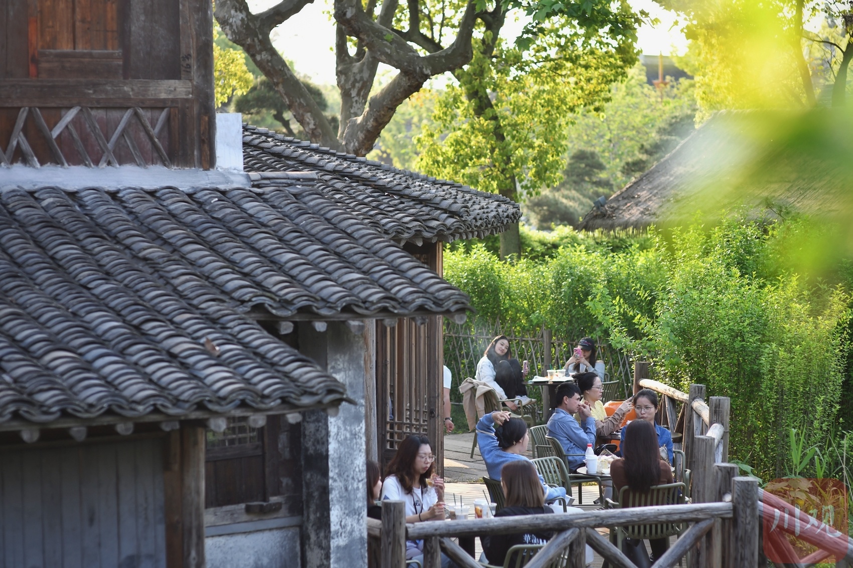 最美江南四月天,不负春光一路行,游客在古镇里品茗谈天。