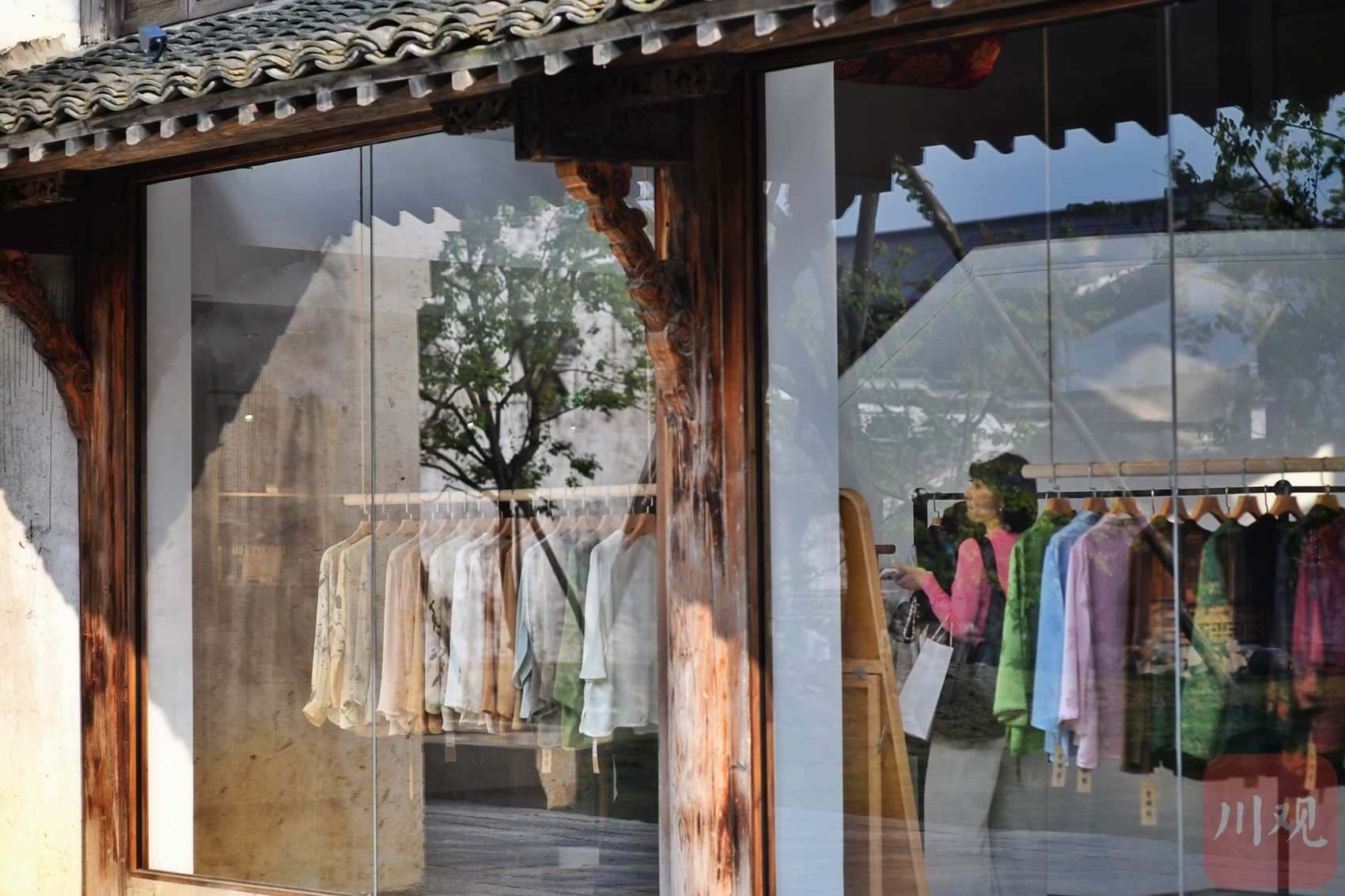 4月26日,游客在古镇里的时尚服饰店里选购新款服饰。