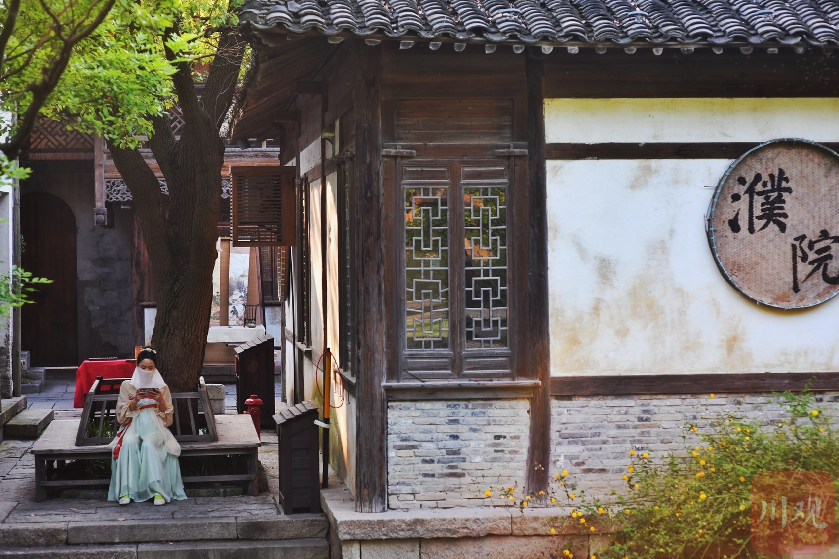 汉服打扮的游客在古镇里小憩,时光仿佛穿越了一般。