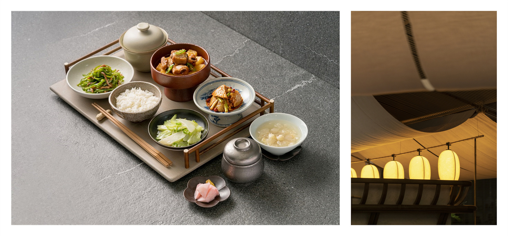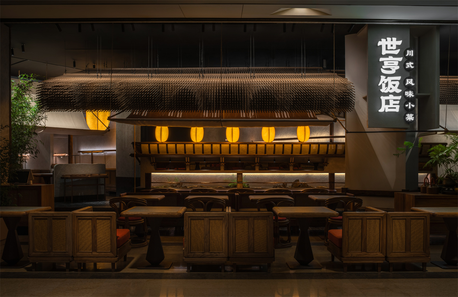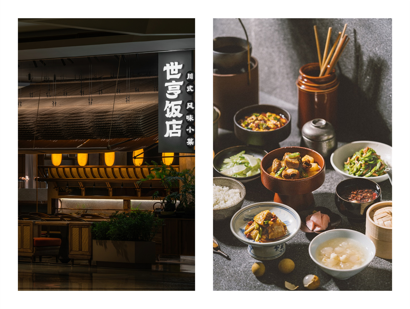 为达到这样的效果,世亨饭店从门店设计、菜品、餐具、灯光、员工制服及服务方式等切口入手,做了细致考量。一眼望去,还原川西民居的“茅屋顶”,暖光白墙,在成都太古里负一层的拐角处勾勒出低调而安静的世亨饭店,含蓄而温暖。