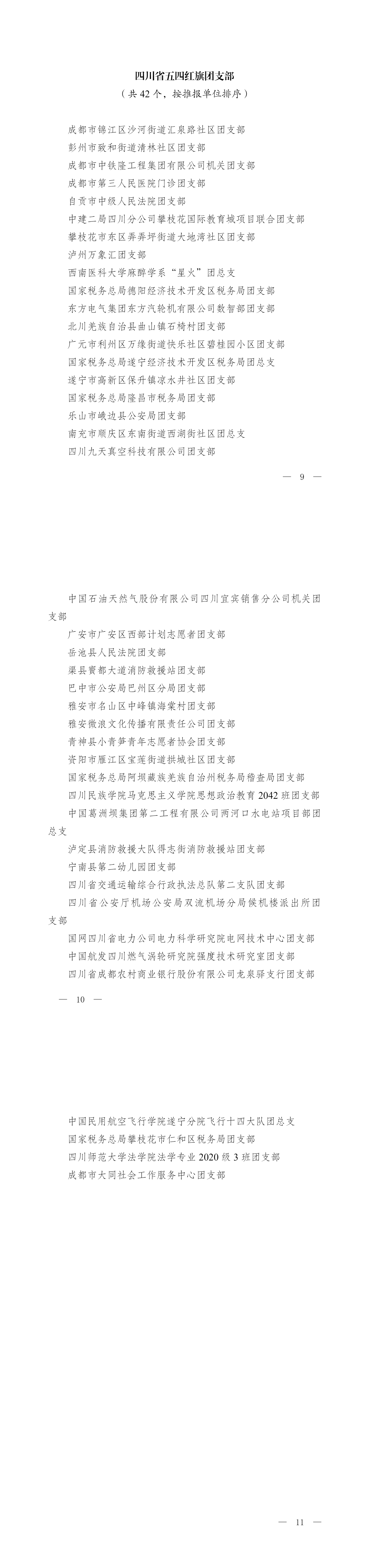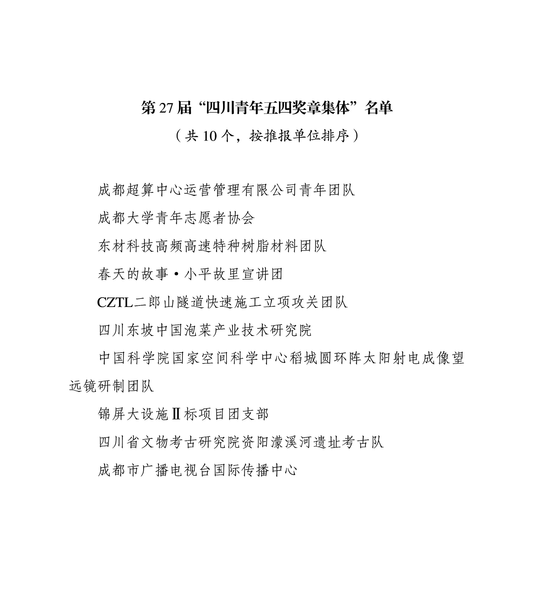 4月29日,记者从共青团四川省委获悉,五四青年节即将到来之际,为表彰先进、树立典型,共青团四川省委、四川省人力资源和社会保障厅决定,授予王成等20名个人第27届“四川青年五四奖章”,授予成都超算中心运营管理有限公司青年团队等10个集体第27届“四川青年五四奖章集体”,授予成都高新区团工委、成都市锦江区沙河街道汇泉路社区团支部等90个团组织四川省五四红旗团委(团支部)称号,授予王祥波、付涛等180名同志四川省优秀共青团员(团干部)称号。